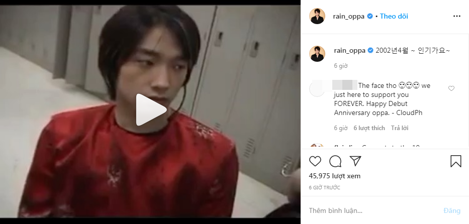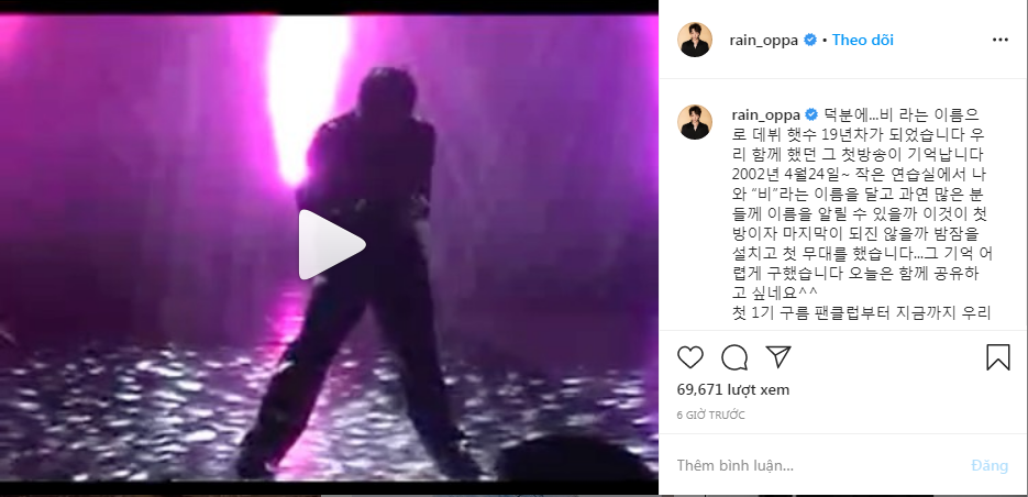 Không chỉ kỷ niệm màn trình diễn đầu tiên, Bi Rain còn khiến các fan hâm mộ rung động khi chia sẻ video về sự chuẩn bị của mình cho sân khấu ý nghĩa này: “Cảm ơn tất cả các fan hâm mộ đã ủng hộ tôi trong suốt những năm qua. Hôm nay là ngày đánh dấu 18 năm kể từ khi tôi phát hành album đầu tay trong sự nghiệp của mình. Tôi vẫn nhớ rất rõ những cảm xúc khi rời phòng tập nhỏ để bước lên sân khấu và biểu diễn lần đầu tiên vào ngày 24/4/2002. Vào ngày đặc biệt này, tôi muốn khoe với các bạn những khoảnh khắc mà tôi đã tìm thấy ngay trước buổi diễn. Một lần nữa, xin cảm ơn đại gia đình Cloud đã luôn ở bên tôi ngay từ những ngày đầu tiên. Tôi yêu tất cả các bạn”.