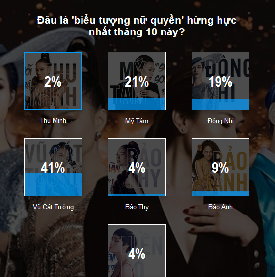 Tuy nhiên, dù có nói gì thì tháng 10 của làng nhạc Việt vẫn là một tháng sôi động của phái nữ, với hàng loạt những sản phẩm chất lượng không thể bàn cãi từ các nữ nghệ sĩ tài năng của chúng ta! Cuộc thăm dò cùng kết quả hoàn toàn mang tính tham khảo, hoàn toàn không nên dựa vào đấy để đưa đến kết luận nào, bạn nhé.