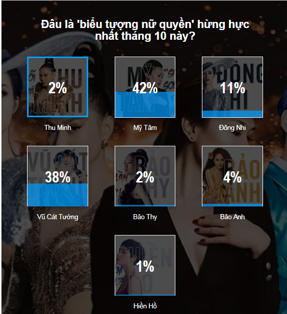 Như vậy, kết thúc thời gian bình chọn cho “biểu tượng nữ quyền” tháng 10, Mỹ Tâm chính là người chiến thắng chung cuộc, tỉ lệ phiếu bầu của nữ ca sĩ Người hãy quên em đi là 42%.