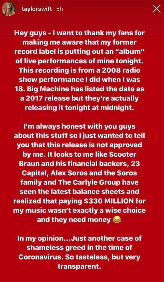 Tôi luôn thành thật với các bạn về vấn đề này nên tôi chỉ muốn nói cho các bạn biết rằng việc phát hành này không được sự đồng ý của tôi. Trông như thể Scooter Braun và quỹ tài chính của ông ta, 23 Capital, Alex Soros, và Gia đình Soros và The Carlyle Group đã xem xét bản báo cáo tài chính mới nhất rồi nhận ra rằng việc trả 330 triệu đô cho âm nhạc của tôi không thật sự là một sự lựa chọn khôn ngoan và họ thì cần tiền.
