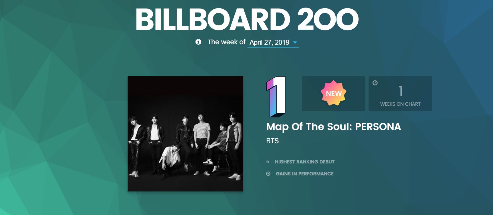 Cụ thể, sau 2 tuần nắm ngôi vương, albumMap of the Soul: Persona tiếp tục xếp vị trí thứ 1 trên BXH Billboard 200 tuần này. Với thành tích đó, BTS trở thành nhóm nhạc đầu tiên sau The Beatles có 3 album liên tiếp lọt vào BXH này trong vòng 1 năm. 2 album trước đó là Love Yourself 轉 Tear và Love Yourself 結 Answer. Không những thế, The Beatles phải dành đến 1 năm, trong khi BTS chỉ cần đúng 1 tuần để làm được điều đó.