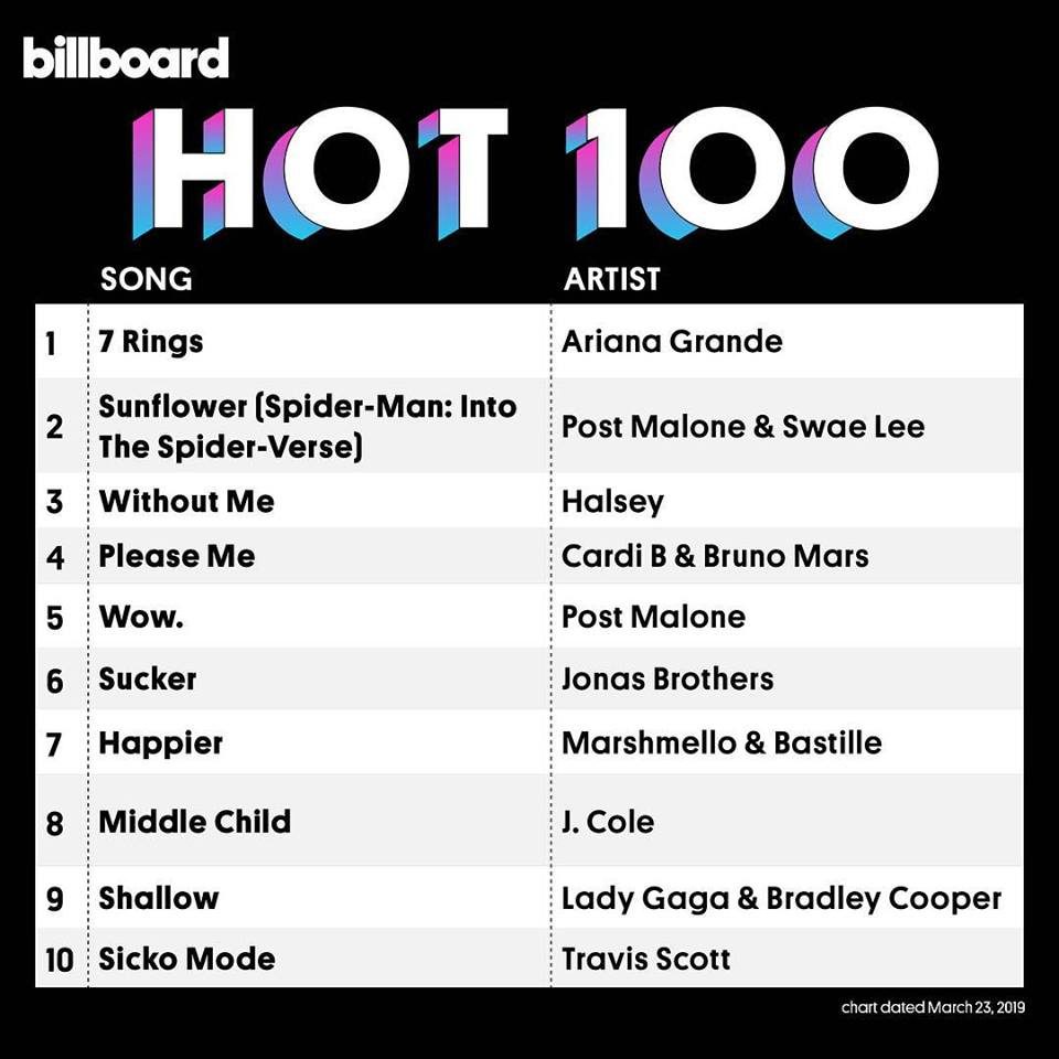 Như vậy, BXH Billboard Hot 100 tuần mới đã chính thức được công bố với khá nhiều xáo trộn so với tuần trước: đáng chú ý nhất là việc 7 Rings của “tiểu diva” Ariana Grande trở lại vị trí đầu bảng, trong khi Sucker của Jonas Brother và Shallow bắt đầu có dấu hiệu “chơi cầu tuột”!