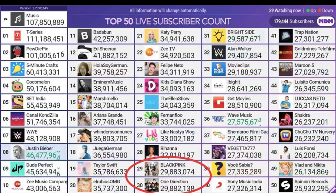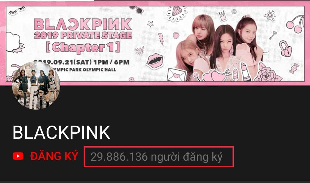 Chiều ngày 8/9, kênh Youtube của BlackPink đã chính thức chạm mốc 29.886.136 lượt đăng ký. Với con số này, girlgroup đình đám từ Kpop đã chính thức vượt mặt One Direction để trở thành nhóm nhạc có kênh Youtube được theo dõi nhiều nhất trên thế giới tính tới thời điểm hiện tại (Kênh Youtube của One Direction: 29.882.906 lượt theo dõi). Đây cũng là lần đầu tiên một nhóm nhạc Hàn Quốc chạm tới con số khủng này trên hệ thống video toàn cầu này, quả không hổ danh khi nhiều người vẫn gọi BlackPink là Nữ hoàng Youtube của Kpop.