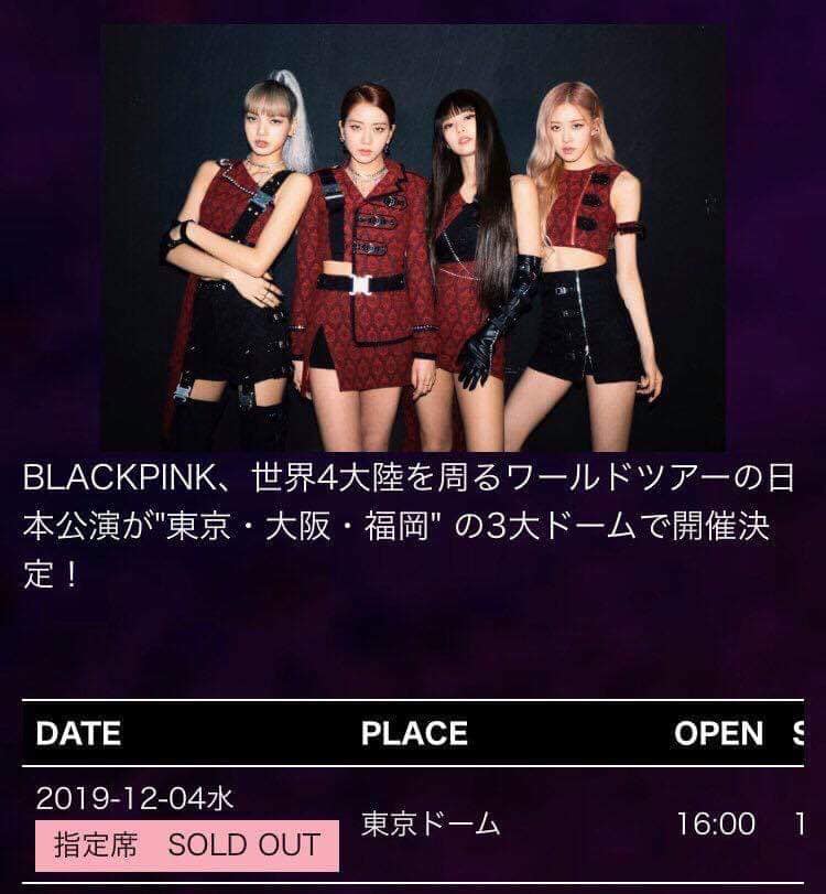 Hiện tại, vé tham dự các đêm diễn ở Kyocera Dome Osaka (4-5/1/2020) và Fukuoka Yahuoku Dome (22/2/2020) đều đã được mở bán. Người hâm mộ hi vọng sẽ đón nhận thêm những tin sold out từ BlackPink trong thời gian sắp tới để có thể lần nữa được chứng kiến hình ảnh hơn 40.000 Blinks cùng tạo thành “biển hồng” ngập tràn như concert ở Kyocera Dome Osaka vào 24/12 năm ngoái.