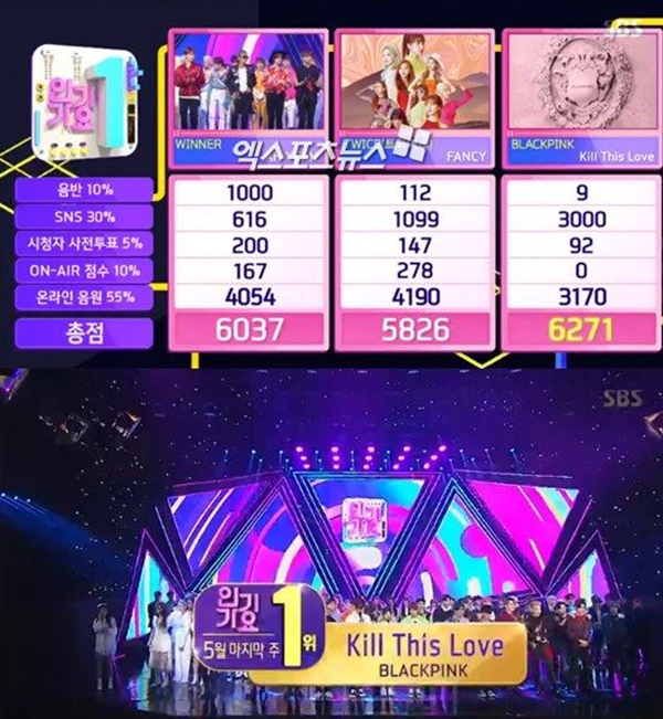 Tuy phải chạm trán với đối thủ “nặng kí” là đàn anh cùng nhà WINNER và nhóm nữ nhà JYP - TWICE, Kill This Love của BlackPink vẫn xuất sắc vượt qua cả 2 dù không có bất cứ sự quảng bá nào trong thời gian qua. Dù điểm trình diễn và vote của girlgroup YG thấp hơn rất nhiều so với WINNER và TWICE nhưng nhờ độ phổ biến trên SNS và lượt nghe duy trì ở mức cao trên các trang nhạc số mà các cô gái đã có tổng điểm nhiều hơn 2 nhóm còn lại.