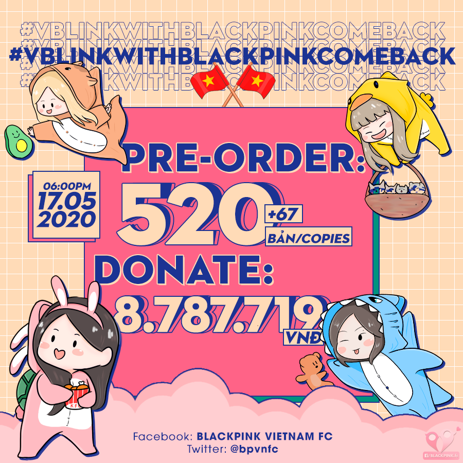 Tính đến ngày 17/5, fanpage lớn nhất của BlackPink đã nhận cọc 520 album. đồng thời số tiền donate đạt gần 9 triệu đồng.