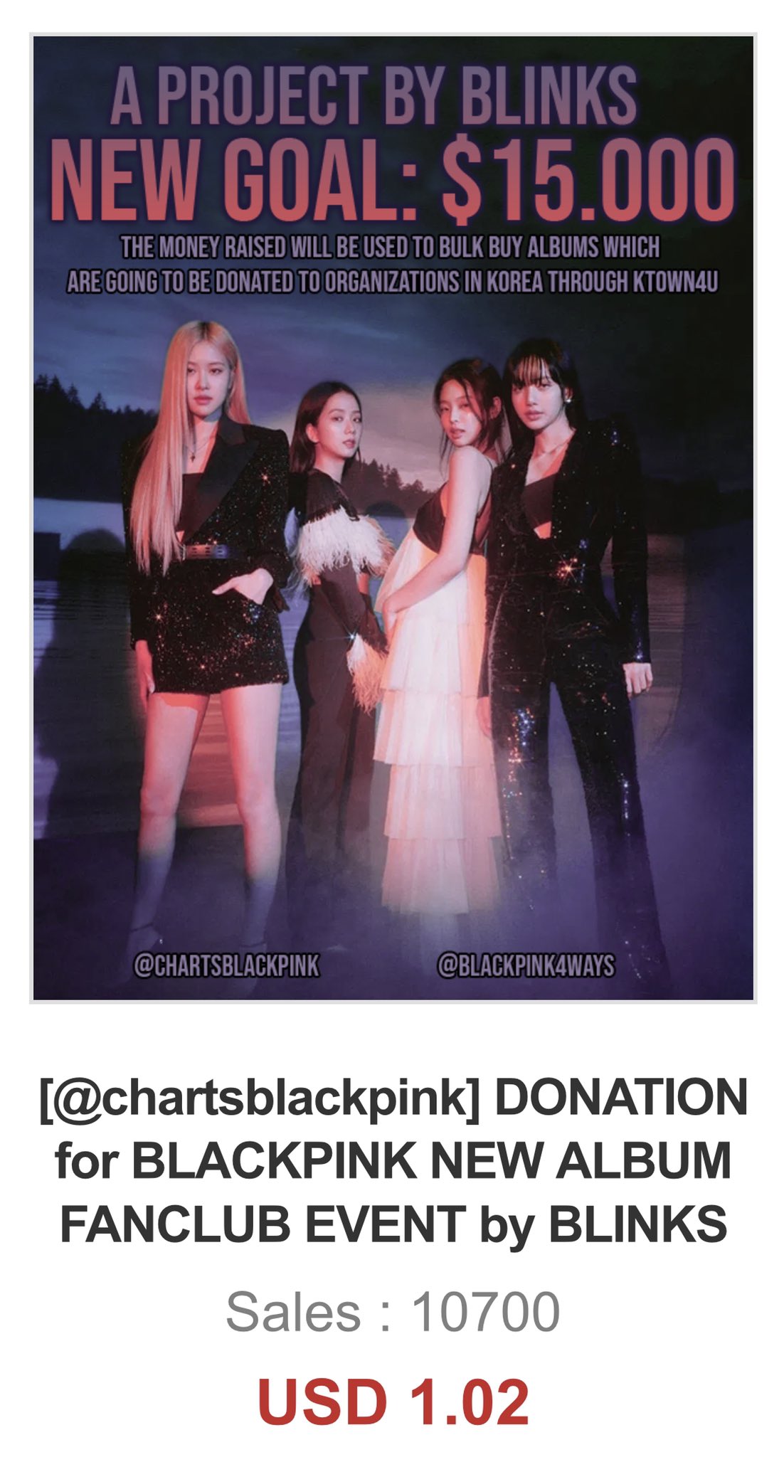 Dự án donate của Blink đã được khởi động từ tháng 12 năm ngoái vì khi đó, YG đã thông báo sẽ cho BlackPink trở lại trong tháng 1/2020. Trải qua nửa năm với tình trạng… không có album để đặt mua, số tiền donate cứ tăng dần và hiện tại đạt đến mức “khủng” không ngờ. Dẫn đầu là các fanbase Trung Quốc với mức donate cán mốc hơn 300.000 bản tính đến ngày 17/5 (quy đổi dựa trên giá bán full album năm nay của YG: 19.300 KRW). Với con số này, album mới của BlackPink hiện tại đang dẫn đầu lượt sale ngày đầu của các nhóm nữ Kpop dù chưa phát hành. Bên cạnh C-Blinks, các fanbase khác trên thế giới, đặc biệt là châu Á cũng đang “đua nhau” tổ chức donate để tăng thành tích cho BlackPink.