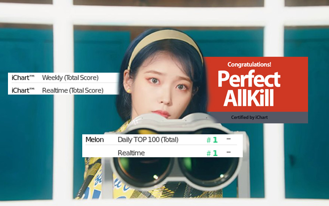 Cụ thể, vào ngày 21 tháng 11, Blueming của IU chính thức đạt Perfect All-kill tất cả BXH âm nhạc Hàn, bao gồm cả BXH tổng hợp iChart. Ca khúc được cô nàng IU ra mắt vào ngày 18 tháng 11, có nghĩa cô nàng chỉ mất khoảng 3 ngày để làm nên điều ấn tượng này. Đặc biệt hơn, đây là ca khúc thứ 2 trong năm 2019 của cô nàng đạt được thành tích PAK này, trước đó là Love Poem.