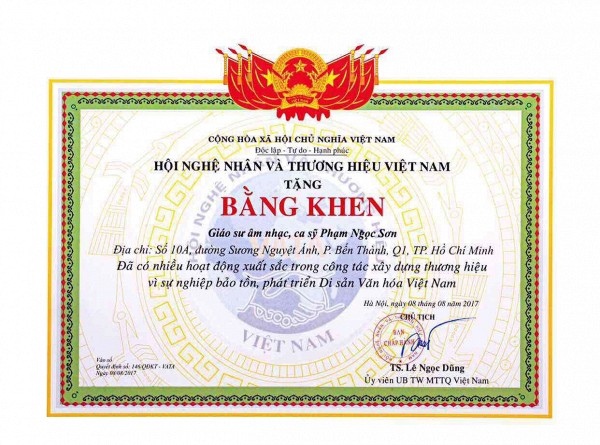 Bằng khen phong tặng danh hiệu “Giáo sư âm nhạc” của Hội Nghệ nhân và Thương hiệu Việt Nam dành cho Ngọc Sơn.