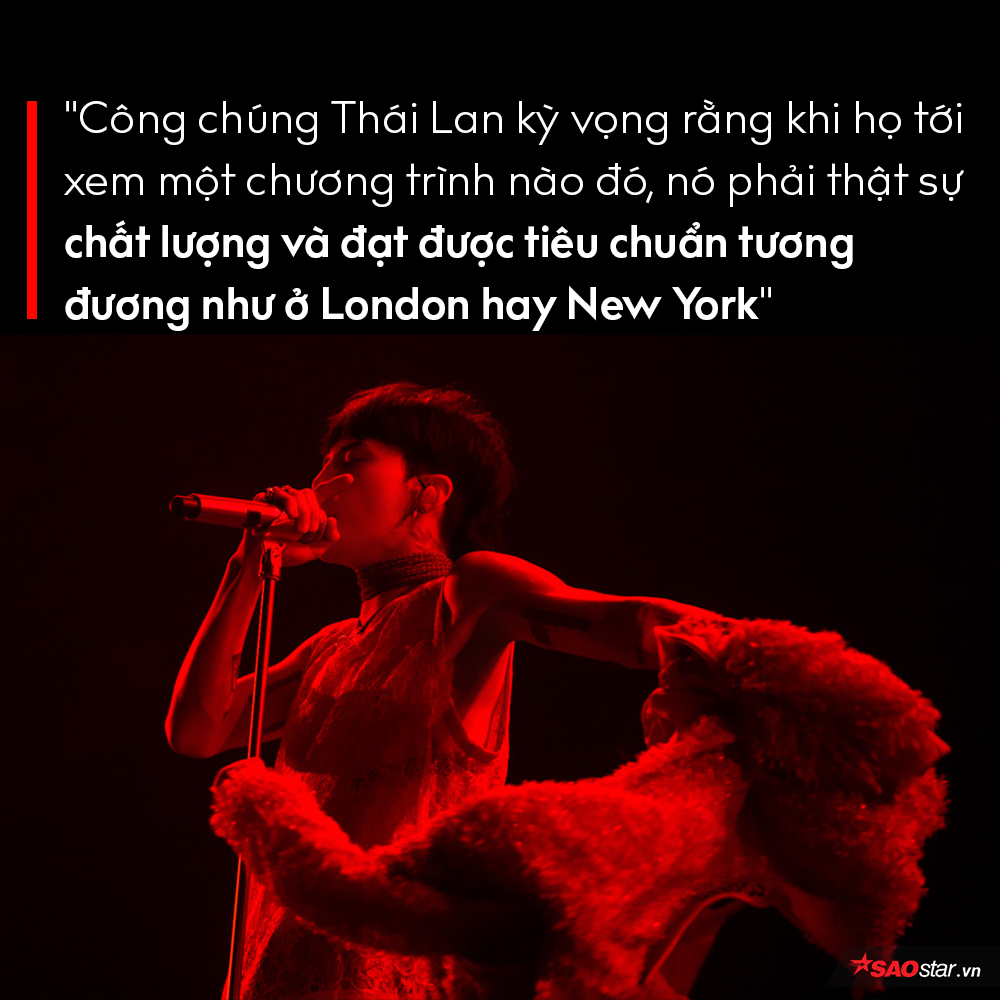 Bất cứ một vấn đề nào cũng có hai mặt của nó. Có những show cháy vé, có show không. Giá vé của mỗi concert còn phụ thuộc vào nhiều yếu tố như khâu sản xuất, giá phải trả để mời nghệ sĩ… Thị trường Thái Lan đang ngày càng trở nên phức tạp, chúng tôi đã cùng nhau xây dựng nó suốt 30 năm qua. Công chúng Thái Lan có kỳ vọng rằng khi họ tới xem một chương trình nào đó, nó phải thật sự chất lượng và đạt được tiêu chuẩn tương đương như concert tại London hay New York. Khán giả Thái Lan muốn được đối xử công bằng, họ sẵn sàng chi tiền để thu về những trải nghiệm “đáng đồng tiền bát gạo”.