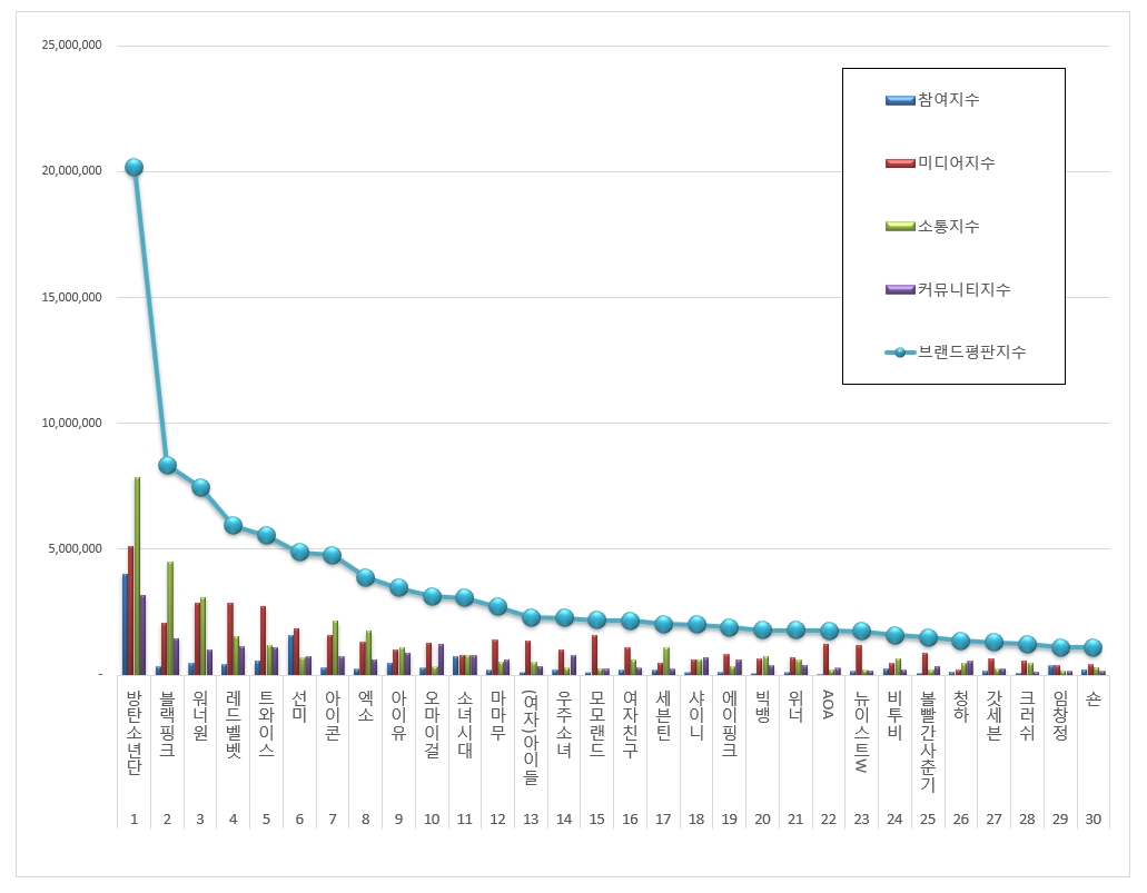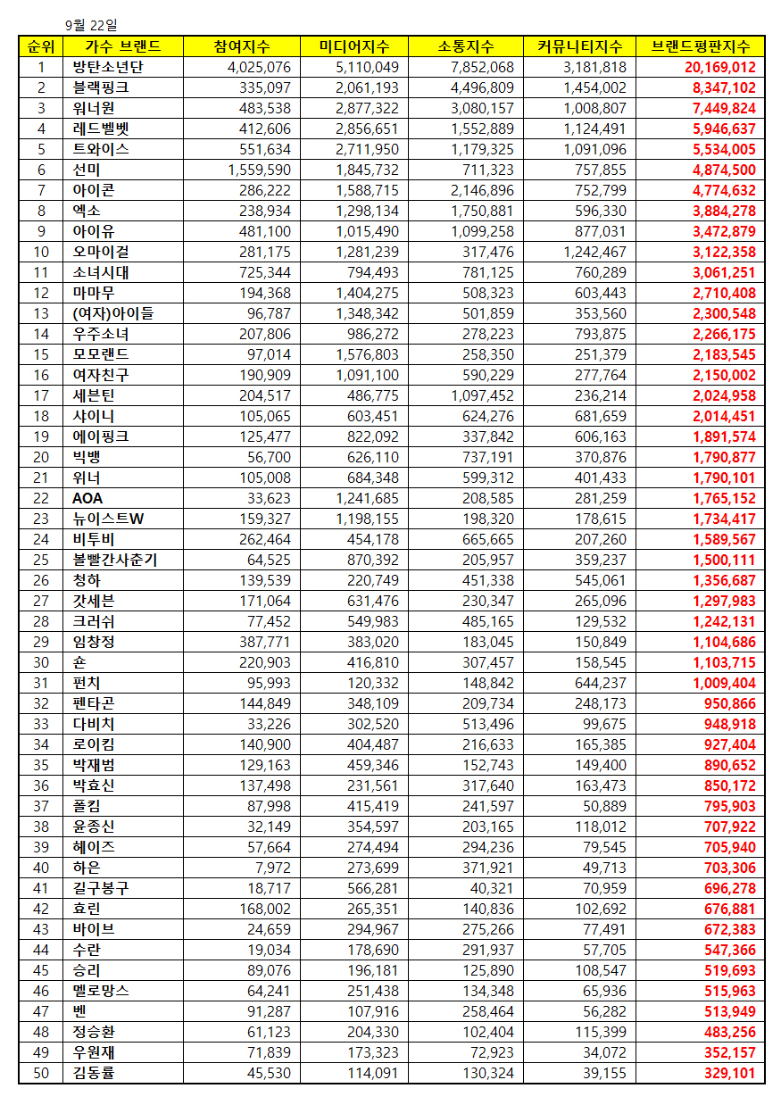 Theo chỉ số thống kê từ ngày 22/8 - 21/9, top 3 ca sĩ, nhóm nhạc idol dẫn đầu BXH giá trị thương hiệu tháng 8 lần lượt thuộc về BTS, BlackPink và Wanna One. Trong đó, BTS giành chiến thắng áp đảo với số điểm 20.169.012, nhiều gấp hơn 2 lần so với nhóm nhạc nữ về nhì là BlackPink với 8.347.102 điểm.
