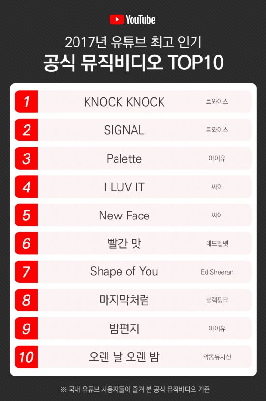 Danh sách 10 ca khúc phổ biến nhất tại Hàn Quốc năm 2017 do Youtube công bố.
