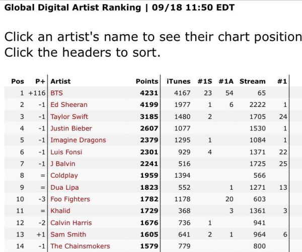 BTS đứng đầu BXH Global Digital Artist Ranking.