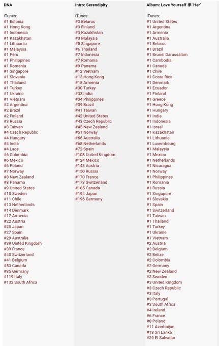 Không dừng lại ở đó, những cái tên trên đỉnh BXH tổng kết iChart lần lượt bị thay thế bởi cái tên DNA chỉ trong vài giờ sau đó. Trong nước là vậy, ca khúc còn nhanh chóng thể hiện sức lan tỏa khi lập kỷ lục đứng đầu BXH iTunes của 73 quốc gia trên thế giới. Từ khóa BTS, tên album và ca khúc cũng trở thành Hot Trend lọt top 30 từ khóa được tìm kiếm nhiều nhất trên MXH và Youtube, No.1 tab thịnh hành tại vô số các quốc gia trên thế giới, trong đó có cả các thị trường âm nhạc khó tính như Mỹ.