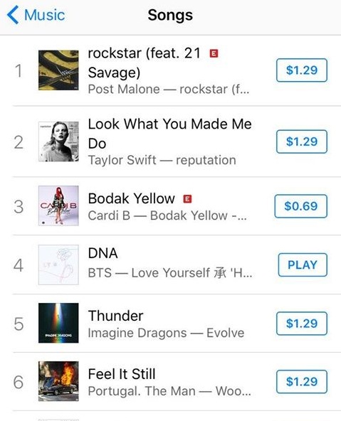 DNA chễm chệ trên vị trí thứ 4 BXH iTunes Song Chart tại Mỹ.