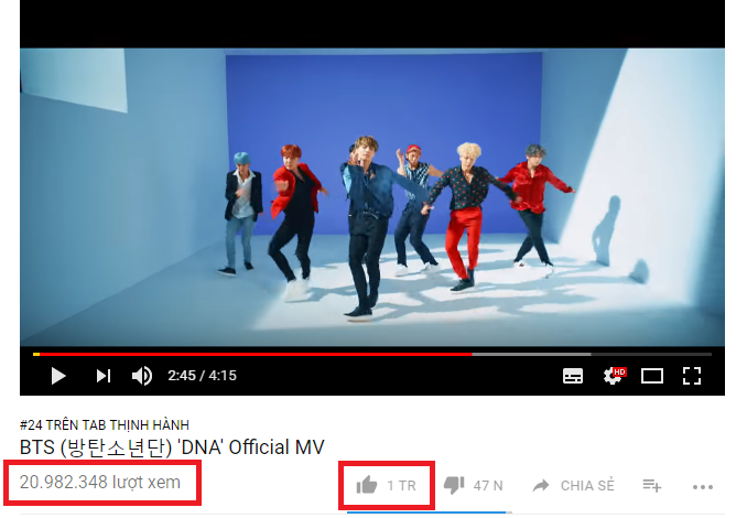 DNA đạt 20,98 triệu lượt xem sau 24h, phá vỡ kỷ lục 13,3 triệu lượt xem của As If It's Your Last của BlackPink trước đó.
