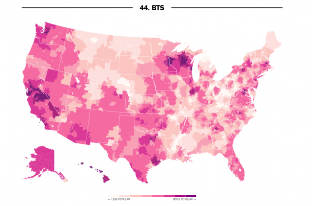 Trong bảng danh sáng, BTS xếp ở vị trí thứ 44, đồng thời là nhóm nhạc Kpop duy nhất được vinh danh. Nhóm được người hâm mộ tìm kiếm và ưa thích nhất tại Hawaii, California và phía Bắc Wisconsin với tầm ảnh hưởng dường như lan rộng tới toàn châu lục.