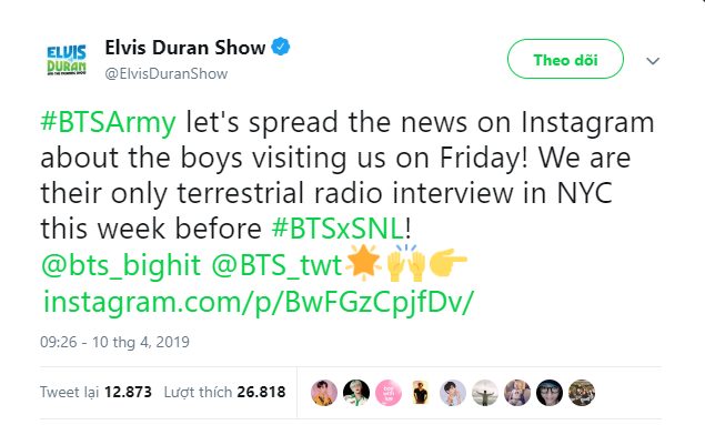 Trên Twitter của chương trình, Elvis Duran đã tiết lộ rằng: “Các Army của BTS tốt hơn hết nên lan truyền thông tin lên Instagram rằng 7 chàng trai sẽ ghé thăm chúng tôi vào thứ 6 này! Chúng tôi sẽ độc quyền phỏng vấn họ tại New York trong tuần này trước khi nhóm biểu diễn lead single tại SNL (Saturday Night Live).” Ở buổi phỏng vấn này, BTS có thể sẽ tiết lộ những thông tin nóng hổi xoay quanh album phòng thu mới mang tựa đề Map Of The Soul: Persona. Nếu bạn là người hâm mộ của nhóm, bạn chắc chắn không thể bỏ qua chương trình này.