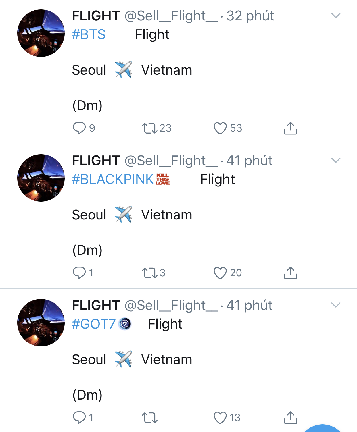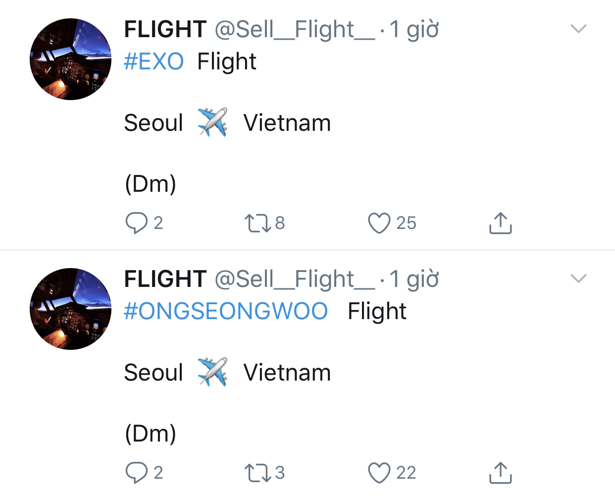 Cụ thể, một tài khoản chuyên rao bán thông tin chuyến bay của các nghệ sĩ K-Pop vừa mới cập nhật thông tin chuyến bay của 5 cái tên và đặc biệt, địa điểm bay đến của họ chính là Việt Nam. 5 nghệ sĩ được tài khoản này đăng tải thông tin chuyến bay bao gồm: BTS, BLACKPINK, EXO, GOT7 và Ong Seungwu. Như vậy, sau tin đồn BLACKPINK và EXO sẽ đến Việt Nam được lan truyền cách đây 1 tháng thì với thông tin này, BTS, GOT7 và Ong Seungwu là những cái tên tiếp theo được đồn đoán là sẽ đặt chân đến mảnh đất hình chữ S để tham dự sự kiện Asia Artist Awards 2019.