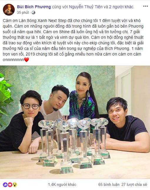 Cách đây ít phút, Bích Phương đã đăng tải trên trang cá nhân của mình hình ảnh chụp cùng 7 chiếc cúp và những cảm xúc sau một đêm tuyệt vời vừa qua. Cô chia sẻ: “7 giải thưởng thật sự là 1 bất ngờ và vinh dự quá lớn. Cám ơn hội đồng nghệ thuật đã trao sự động viên khích lệ tuyệt vời này cho ekip chúng tôi, đặc biệt là giải thưởng Nữ ca sĩ của năm đầu tiên trong sự nghiệp của Bích Phương. Một năm quá trọn vẹn, 2019 chúng tôi sẽ cố gắng nhiều hơn nữa, cám ơn”.