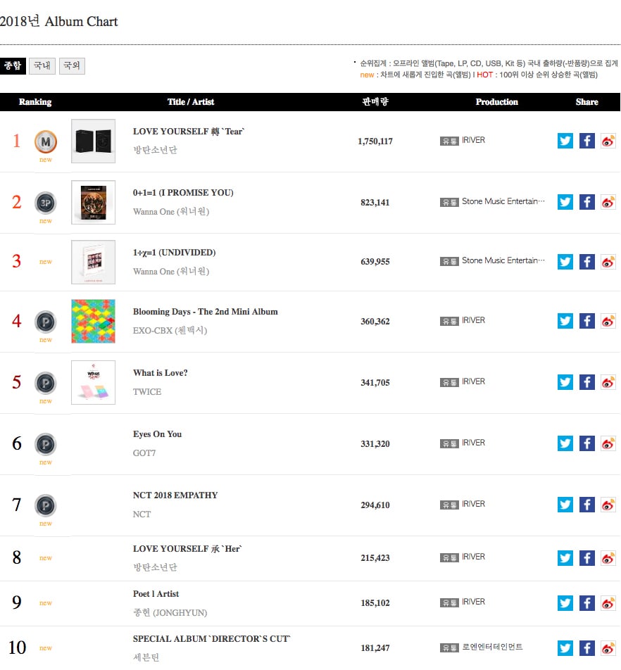Đại diện Bighit Entertainment, BTS chiếm ngôi vương tại BXH album nửa đầu 2018 với album Love Yourself: Tear đạt 1,750,117 bản. Đây chắc chắn là một kết quả xứng đáng với nhóm nhạc nam đình đám Kpop với sự nỗ lực, chăm chỉ hoạt động suốt từ đầu năm.