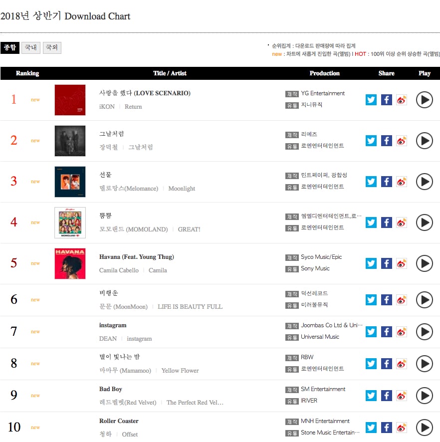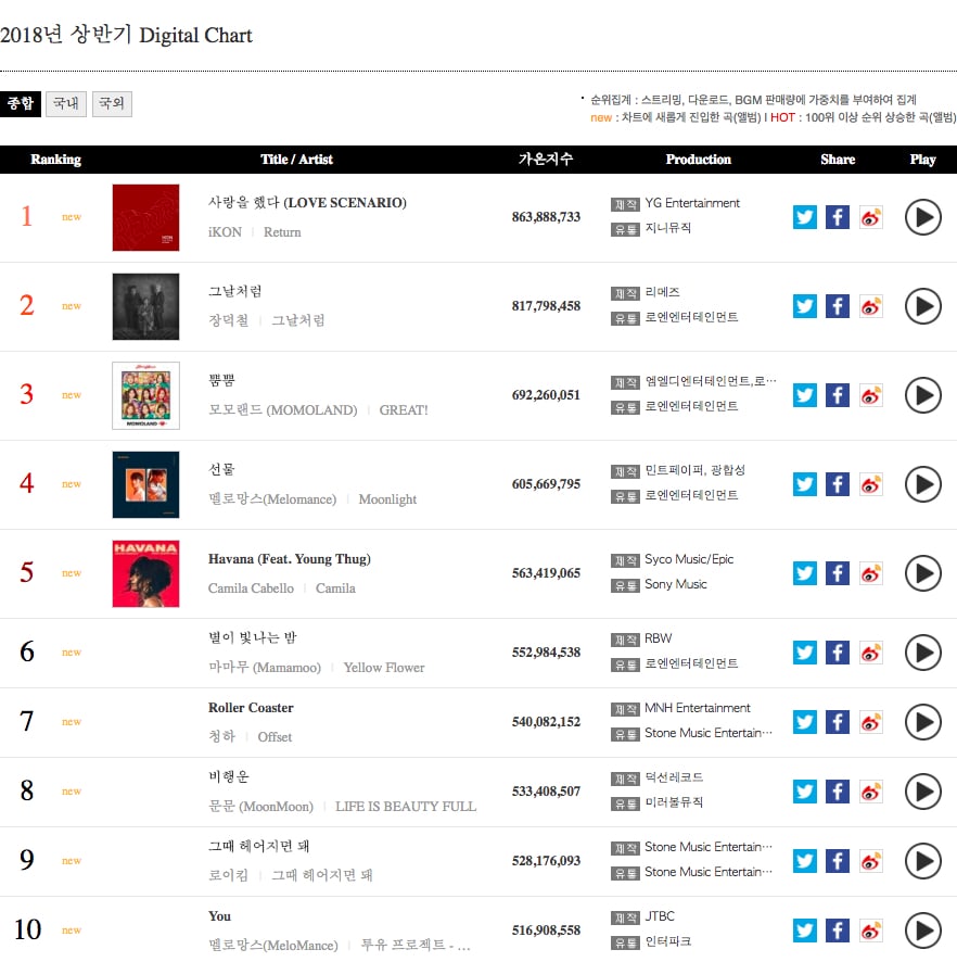 Love Scenario dẫn đầu BXH nhạc số (Digital Chart) với con số ấn tượng 863,888,733 bản kể từ khi ra mắt. Theo sau lần lượt là các ca khúc Good Old Days của Jang Deok Cheol (với 817,798,458 bản) và BBoom BBoom của Momoland (với 692,260,051 bản). Người ra, ca khúc của iKON cũng xuất sắc giành vị trí top1 đối với BXH tải về (Download Chart) và phát trực tuyến (Streaming Chart).
