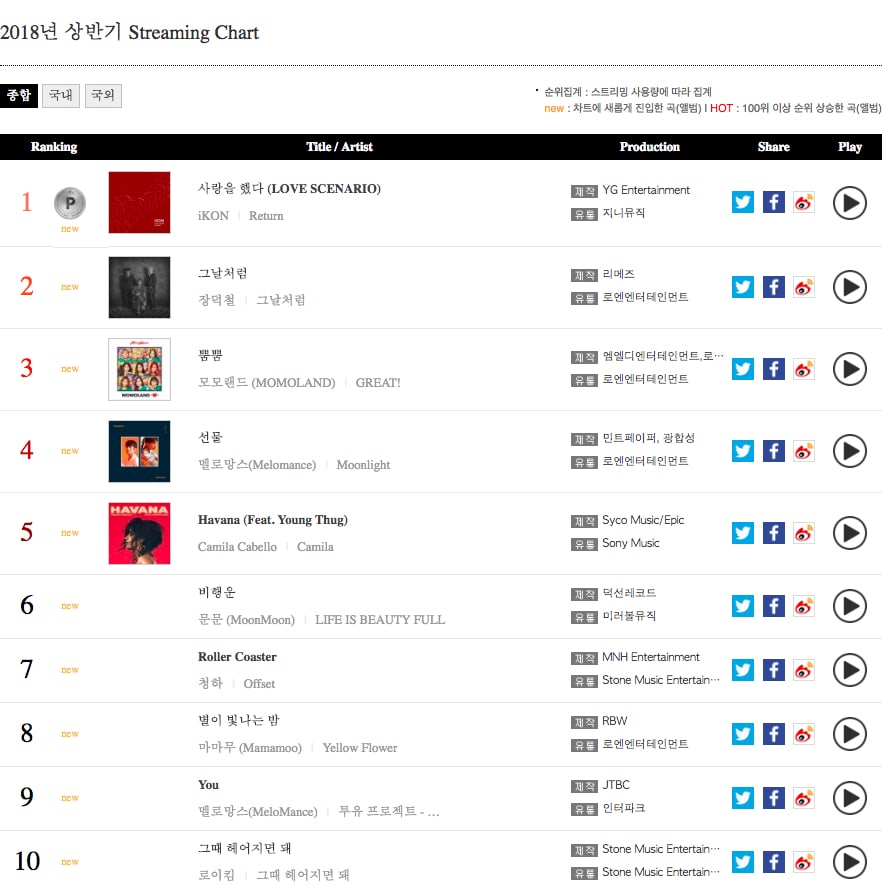 Xuất hiện trong top10 BXH nhạc số nửa đầu 2018 còn có các ca khúc Starry Night (Mamamoo), Roller Coaster (Chung Ha), Contrail (Moon Moon), Only Then (Roy Kim),You (MeloMance), Instagram (DEAN), Bad Boy (Red Velvet). Đáng chú ý, Havana (Camila Cabello) là ca khúc nước ngoài duy nhất lọt vào danh sách.
