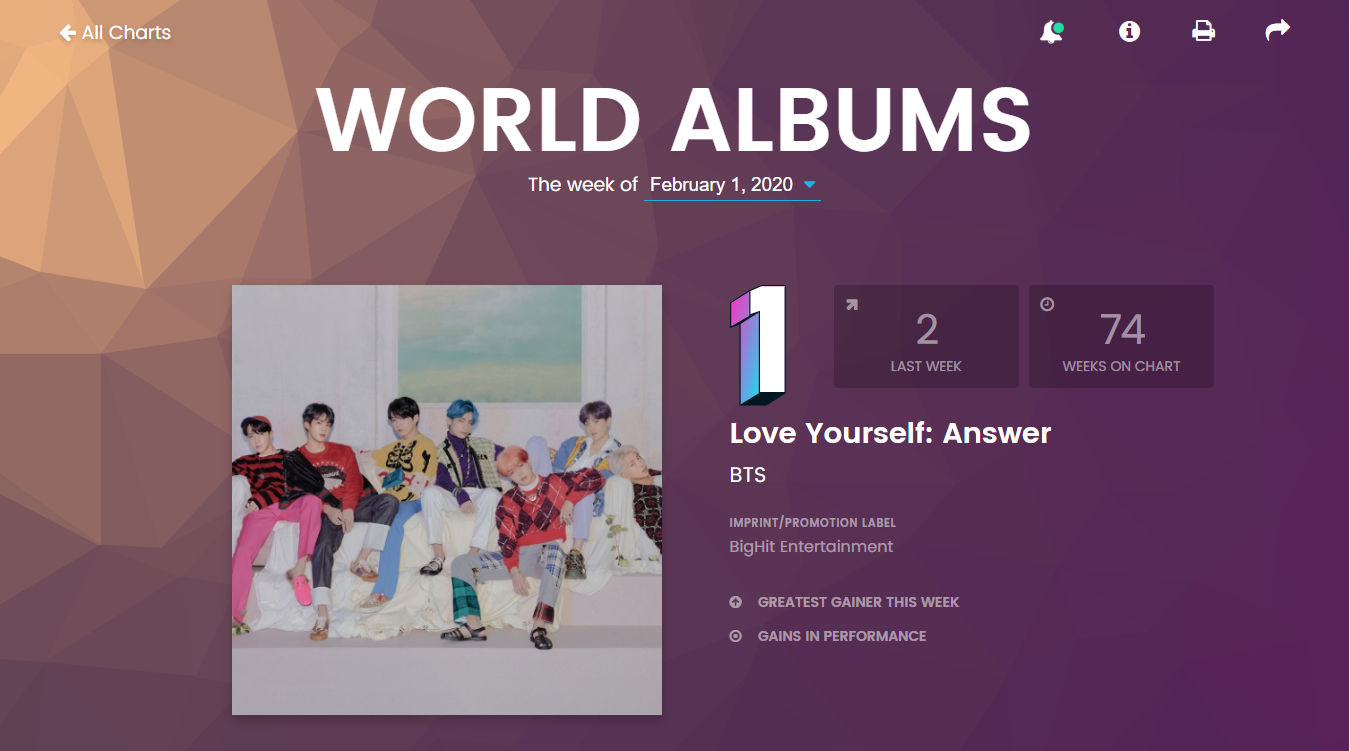 Billboard vừa cập nhật BXH mới cho tuần từ 27/1 đến 2/2. Ở hạng mục World Albums, các sản phẩm từ Kpop vẫn chiếm số đông với 10 hạng trong top 15. Dẫn đầu là BTS với Love Yourself: Answer đã xuất sắc nắm giữ vị trí quán quân tuần này.