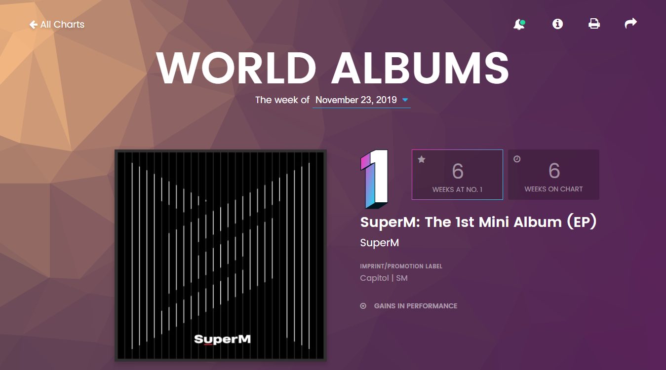 BXH Billboard tuần này vừa được cập nhật ở tất cả các hạng mục. Tại bảng World Albums, số lượng sản phẩm từ các nghệ sĩ Kpop có giảm sút trong top 15, tuy nhiên vẫn chiếm hơn nửa. Riêng ngôi vị quán quân vẫn không thay đổi sau 6 tuần liên tiếp, boygroup dự án nhà SM - SuperM vẫn đang là người nắm giữ “ngai vàng” tại BXH này.