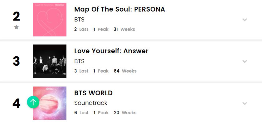 3 vị trí tiếp theo sau SuperM vẫn thuộc về BTS. Tuy nhiên lần này, album Love Yourself: Tear của nhóm đã “mất hút” trên BXH sau 77 tuần bám trụ. 3 album từ top 2 đến 4 của nhóm lần lượt là Map Of The Soul: Persona, Love Yourself: Answer và BTS World.