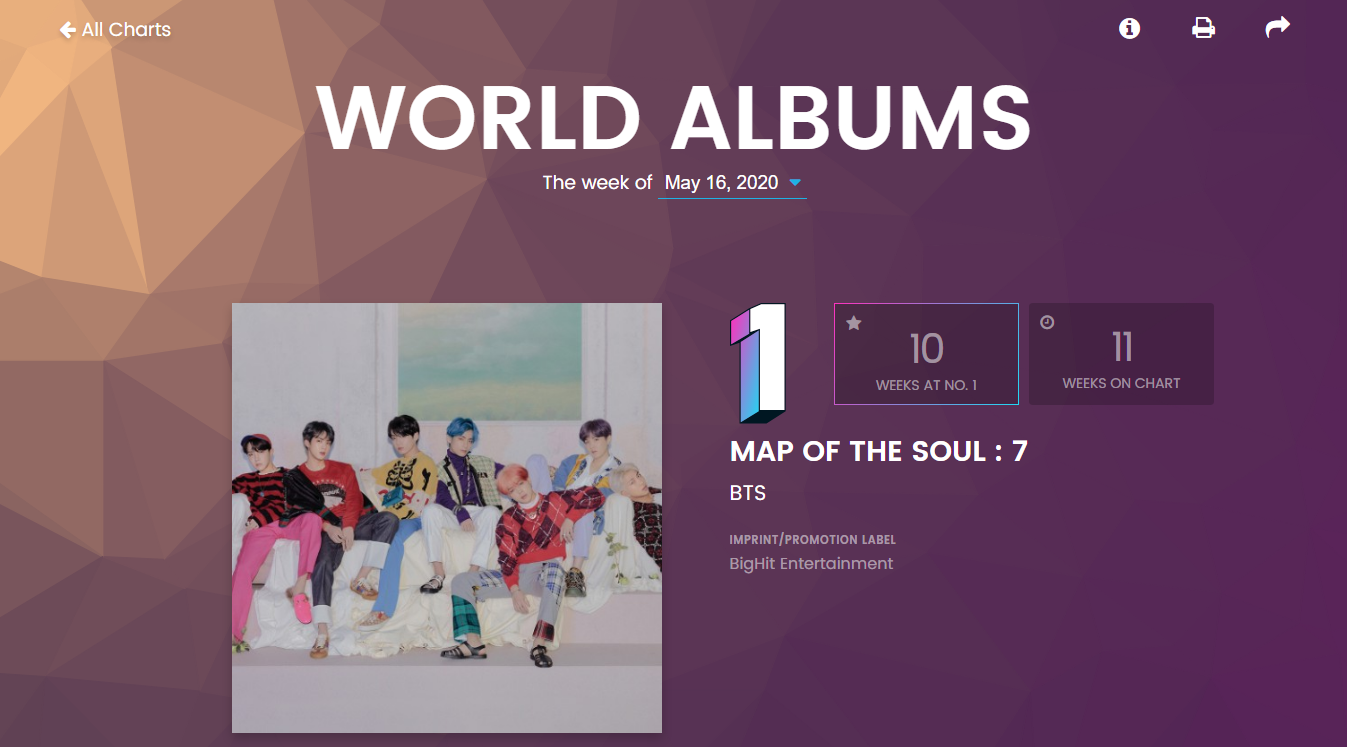 Đây là lần thứ 10 Map Of The Soul: 7 dẫn đầu Billboard World Albums trong suốt 11 tuần charting.