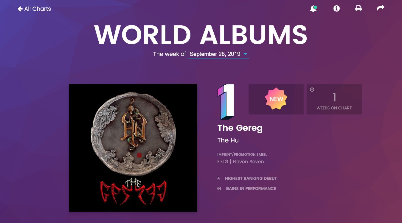BXH Billboard tuần này vừa được cập nhật với nhiều thay đổi bất ngờ. Ở hạng mục World Albums, sau nhiều tuần dẫn đầu, BTS lần này đã để mất top 1. Các chàng trai nhà Big Hit đã bị soán ngôi bởi ban nhạc rock người Mông Cổ The Hu cùng album The Gereg. Dù là tuần đầu tiên xuất hiện trong BXH này nhưng The Hu vẫn đủ sức khiến boyband hàng đầu Kpop phải nhường bước.