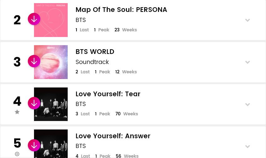 Dù không đứng nhất tuần này nhưng BTS vẫn gây ấn tượng khi chiếm trọn 4 vị trí còn lại trong top 5. Các thứ hạng từ top 2 đến 5 lần lượt là Map Of The Soul: Persona, BTS World, Love Yourself: Tear, Love Yourself: Answer.