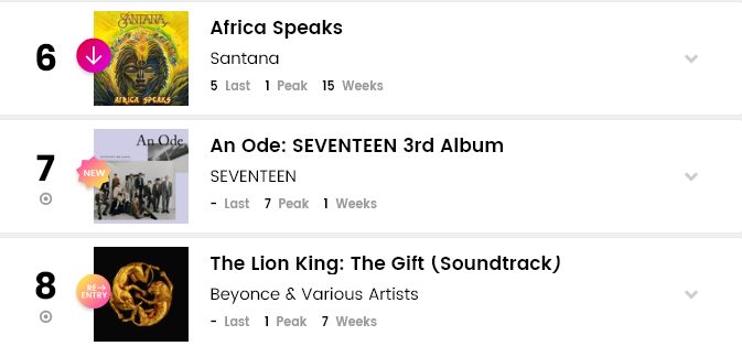 Tiếp sau boygroup nhà Big Hit là ban nhạc rock người Mỹ Santana cùng album Africa Speaks. Vừa trở lại cùng album thứ 3 trong sự nghiệp - An Ode, các chàng trai Seventeen đã debut tại top 7 BXH Wolrd Albums tuần này. Vị trí tiếp theo thuộc về “Ong Chúa” Beyonce với album nhạc phim The Lion King: The Gift. Sau 1 thời gian out top, album soundtrack này bỗng xuất hiện trở lại và “hạ cánh” tại top 8.