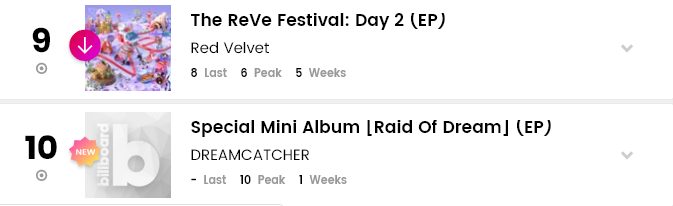 2 vị trí cuối cùng trong top 10 gọi tên 2 girlgroup Kpop: Red Velvet và Dreamcatcher. Hạng 9 thuộc về The ReVe Festival: Day 2 từ các cô gái nhà SM, nhóm đã lùi 1 bậc so với tuần trước. Được “thả xích” vào ngày 18/9, special mini album Raid Of Dream của Dreamcatcher đã debut tại top 10 trong BXH Wolrld Albums lần này.