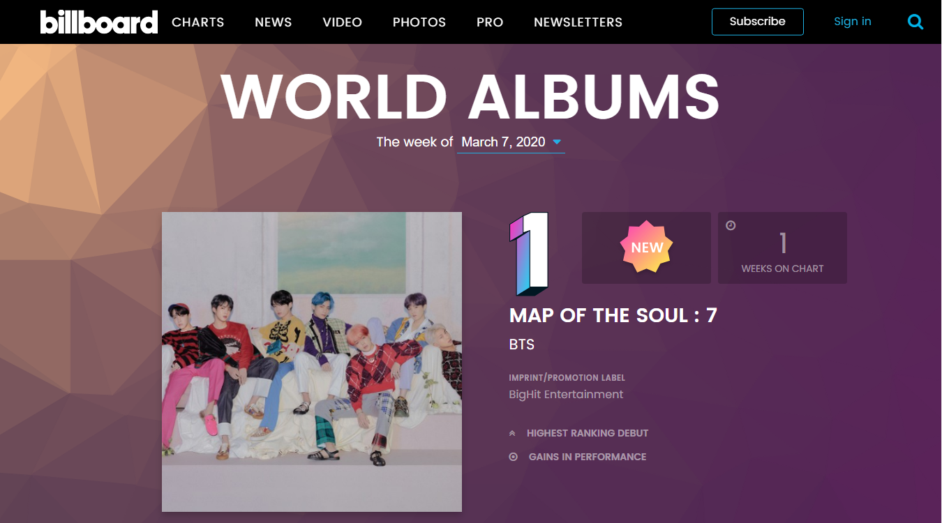 Billboard vừa cập nhật BXH cho tuần mới từ ngày 1/3 đến 7/3. BTS với album mới nhất đã có thành tích ngọt ngào khi lập kỉ lục thế giới tại Billboard 200. Chính vì vậy, ngôi vương Billboard World Albums cũng dễ dàng được boygroup nhà Big Hit chiếm lấy. Map Of The Soul: 7 đã có màn debut ấn tượng khi “on top” BXH này ngay từ tuần đầu tiên charting.