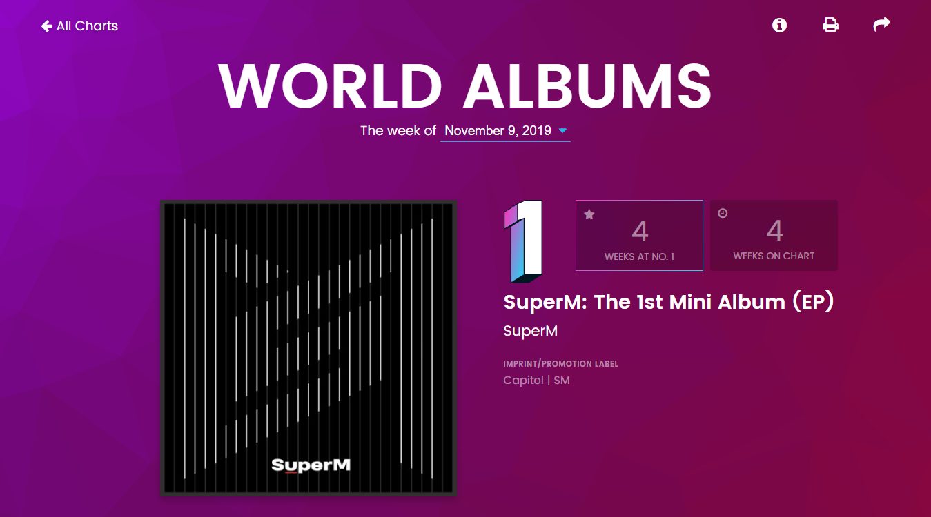 Các hạng mục trên BXH Billboard của tuần từ 4/11 đến 9/11 vừa được cập nhật. Ở bảng Billboard World Albums, các sản phẩm từ Kpop chiếm đến 2/3 top 15. Xuất sắc nhất là SuperM với việc giữ ngôi quán quân 4 tuần liên tiếp kể từ khi debut.