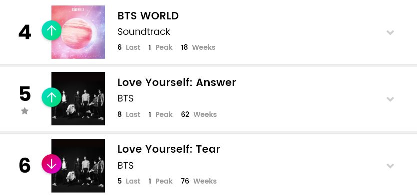 3 albums khác của BTS cũng nằm từ top 4 đến 6.