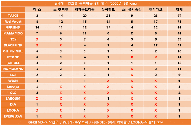 Chiếc cúp trên show âm nhạc hàng tuần là bước đệm thành công của rất nhiều nhóm nhạc và cũng được xem như một dấu hiệu lớn trong việc được công chúng đón nhận, độ nổi tiếng của các nhóm nhạc cũng tỷ lệ thuận với số cúp mà họ đạt được ở mỗi đợt comeback. Mới đây, cư dân mạng đã tổng hợp những nhóm nhạc nữ thế hệ 3 giành được nhiều cúp nhất tính từ khi debut đến tháng 05/2020. Mặc dù mỗi nhóm đều có thời gian ra mắt khác nhau nhưng số liệu này cũng phần nào phản ánh sự yêu thích của công chúng đối với nhóm nhạc.