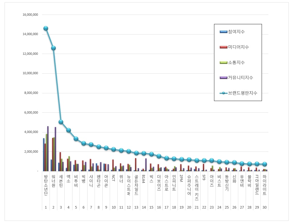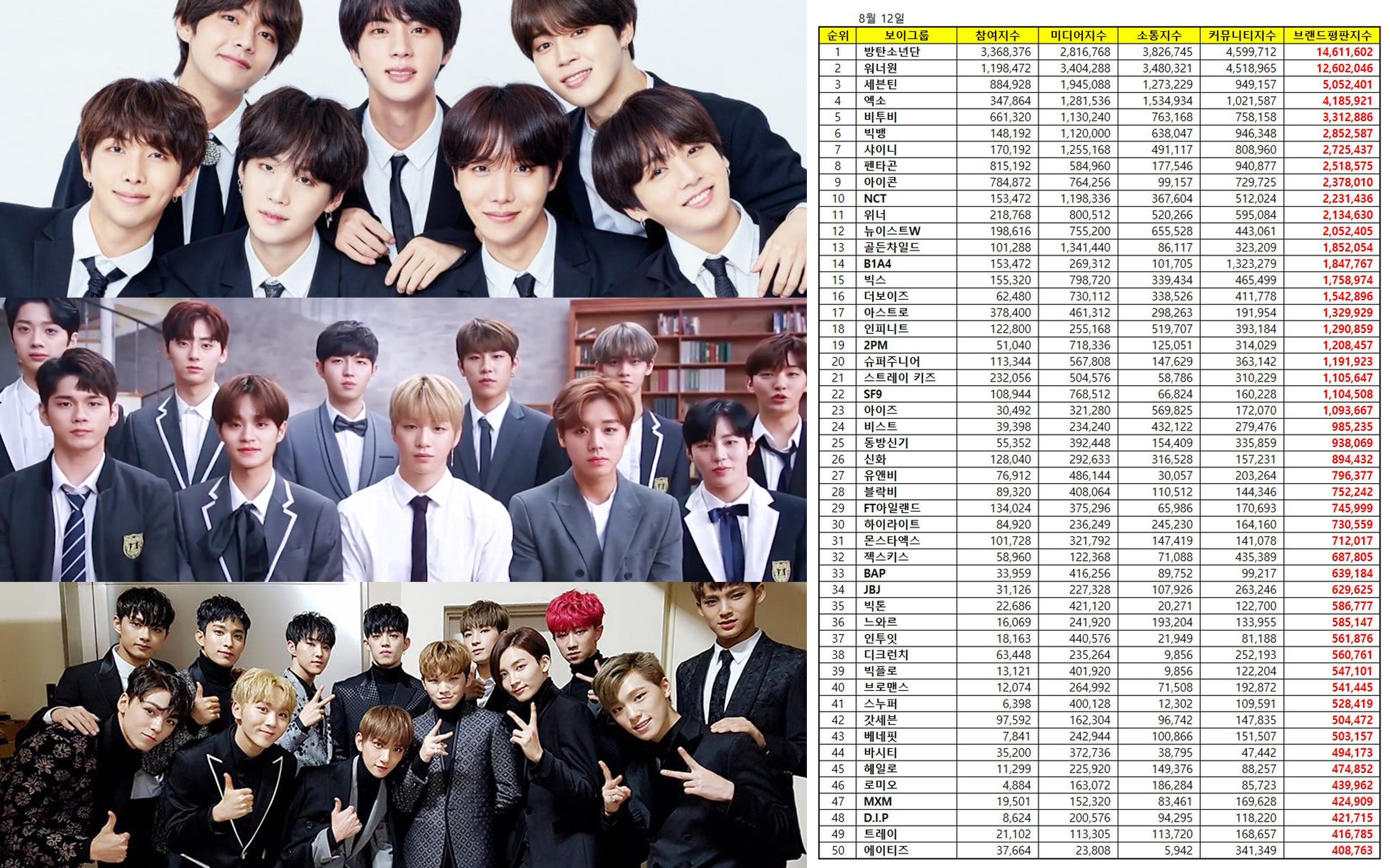 Mới đây, BXH thương hiệu nhóm nam được tổng hợp từ ngày 10/7 đến ngày 11/8 đã được công bố. Thống kê dựa trên những phân tích của chuyên gia về mức độ bao phủ truyền thông của nhóm nhạc và sự tương tác của khán giả.
