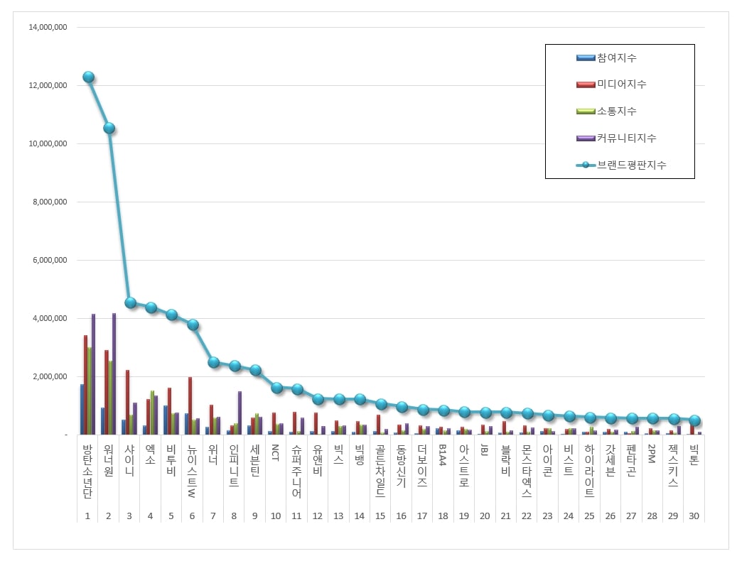 Các vị trí tiếp theo trên bảng xếp hạng thương hiệu tháng này lần lượt thuộc về EXO, BTOB, NU'EST W, WINNER, INFINITE, Seventeen, NCT, Super Junior, UNB, VIXX, Big Bang, Golden Child, TVXQ, The Boyz, B1A4, ASTRO, JBJ, Block B, MONSTA X,…
