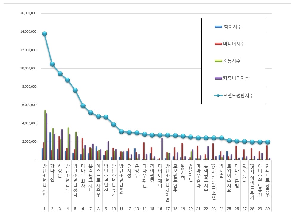 Jimin xuất sắc giữ vững ngôi đầu bảng 2 tháng liên tiếp với tỉ lệ tăng điểm ấn tượng: 47.67% so với tháng trước, nâng tổng điểm lần này lên 13.776.797. Các từ khoá được tìm kiếm nhiều nhất gắn với tên anh chàng bao gồm “Promise”, “Hong Kong”, và “Youtube”. Bên cạnh đó, top 3 tính từ được sử dụng để nói về nam idol là “đẹp trai”, “dễ thương” và “làm tốt”. Phản ứng tích cực chiếm hầu hết với tỉ lệ 92.02%.