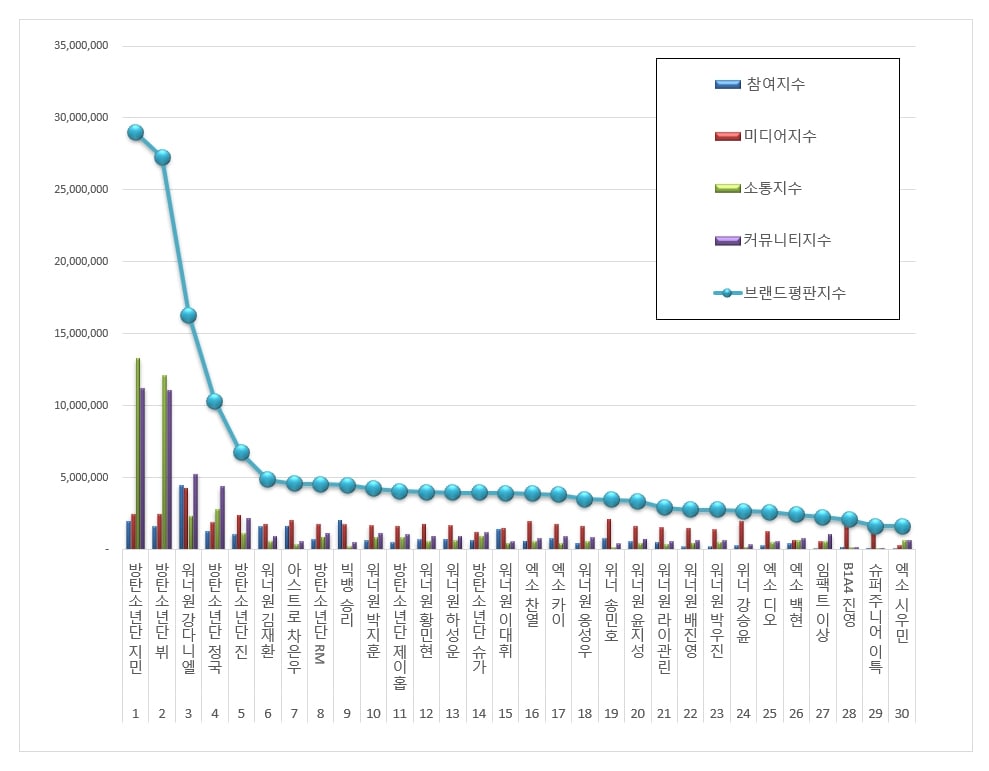 Jimin của BTS đã vươn lên dẫn đầu BXH thương hiệu thành viên nhóm nam của tháng 1 - chứng kiến mức tăng ấn tượng 116,99% so với chỉ số danh tiếng thương hiệu tháng 12 của anh. Thành viên đến từ BTS có tổng chỉ số danh tiếng thương hiệu là 28.968.574.