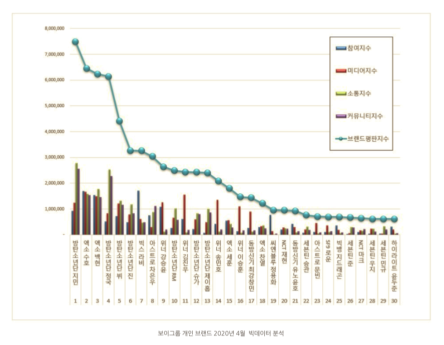 Mới đây, viện nghiên cứu danh tiếng Hàn Quốc (Korea Institute of Corporate Reputation) đã chính thức công bố BXH thương hiệu thành viên nhóm nhạc nam tháng 4. Bảng xếp hạng này được xác định thông qua những phân tích từ người tiêu dùng, độ phủ sóng truyền thông, truyền thông mạng xã hội và chỉ số nhận thức cộng đồng của 598 thành viên nhóm nam. Kết quả được thống kê từ 18/3 đến ngày 16/4 năm 2020.