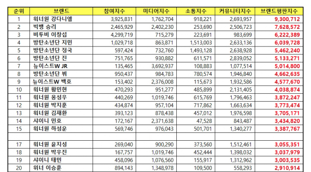 Mới đây, Bảng xếp hạng thương hiệu thành viên nhóm nam tháng 7 đã được viện nghiên cứu kinh doanh Hàn Quốc công bố. Kết quả này được xác định bằng cách phân tích 195.184.191 mẩu dữ liệu từ ngày 19/6 đến ngày 20/7 trên 445 thành viên nhóm nhạc nam trong các phần tham gia của người tiêu dùng, phủ sóng truyền thông, truyền thông và nhận thức cộng đồng.