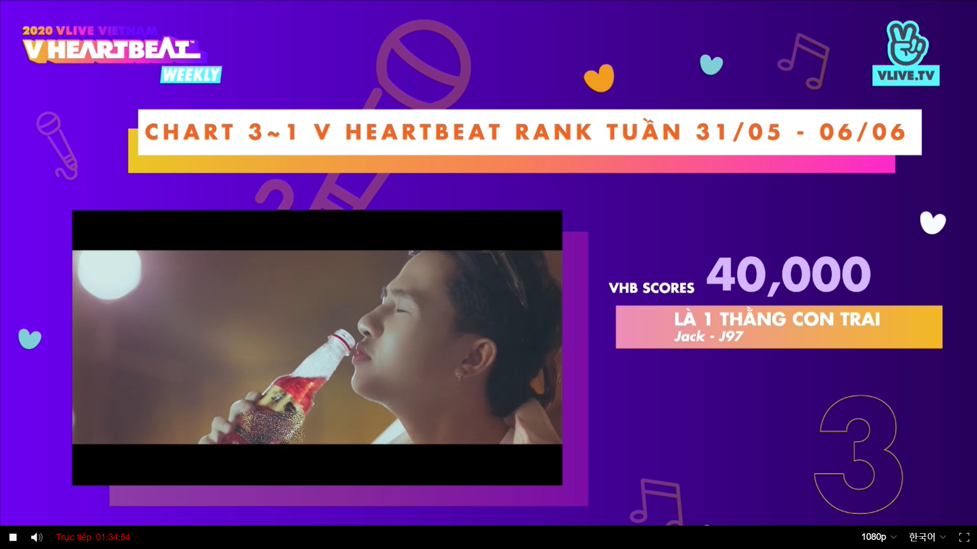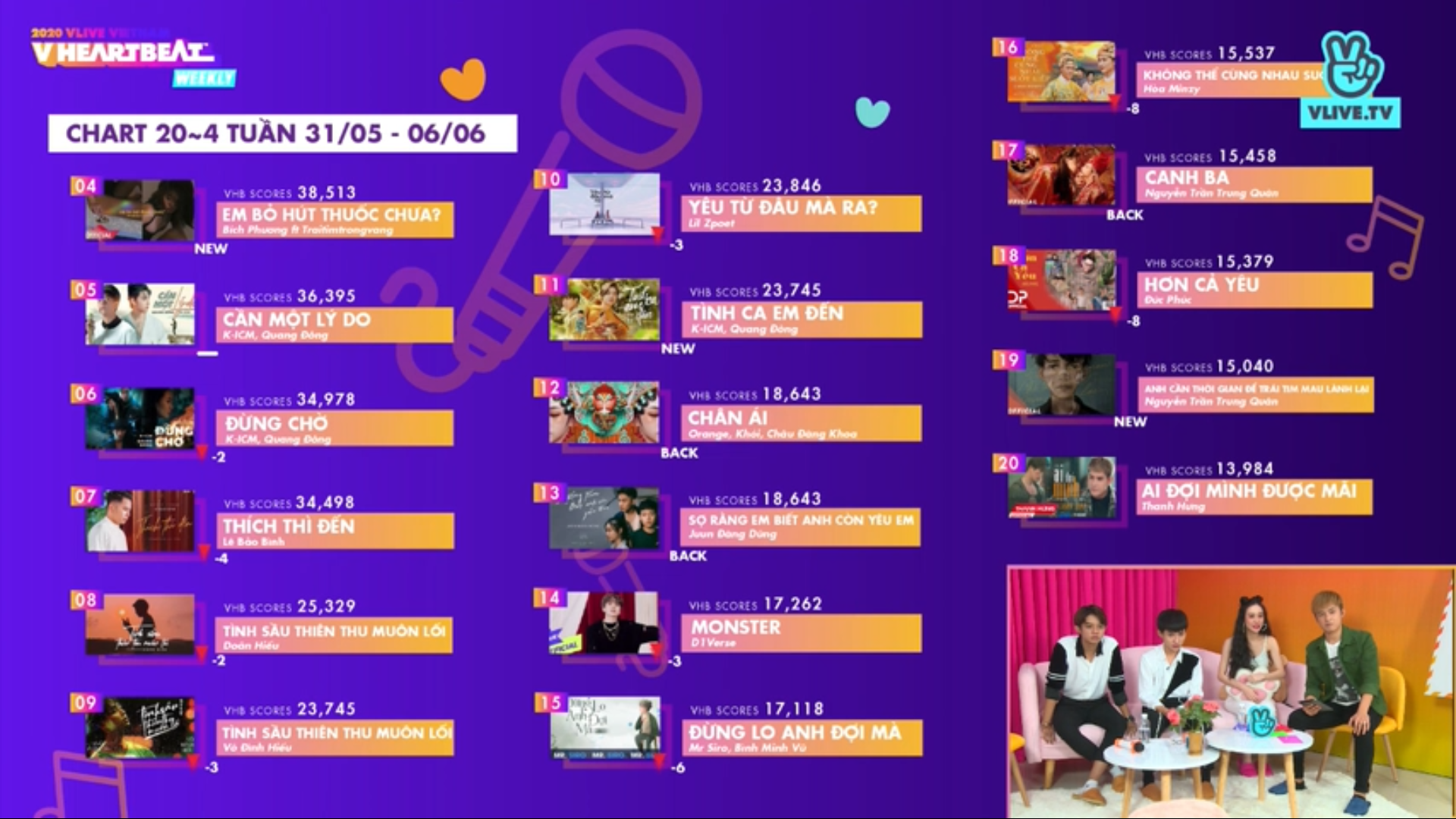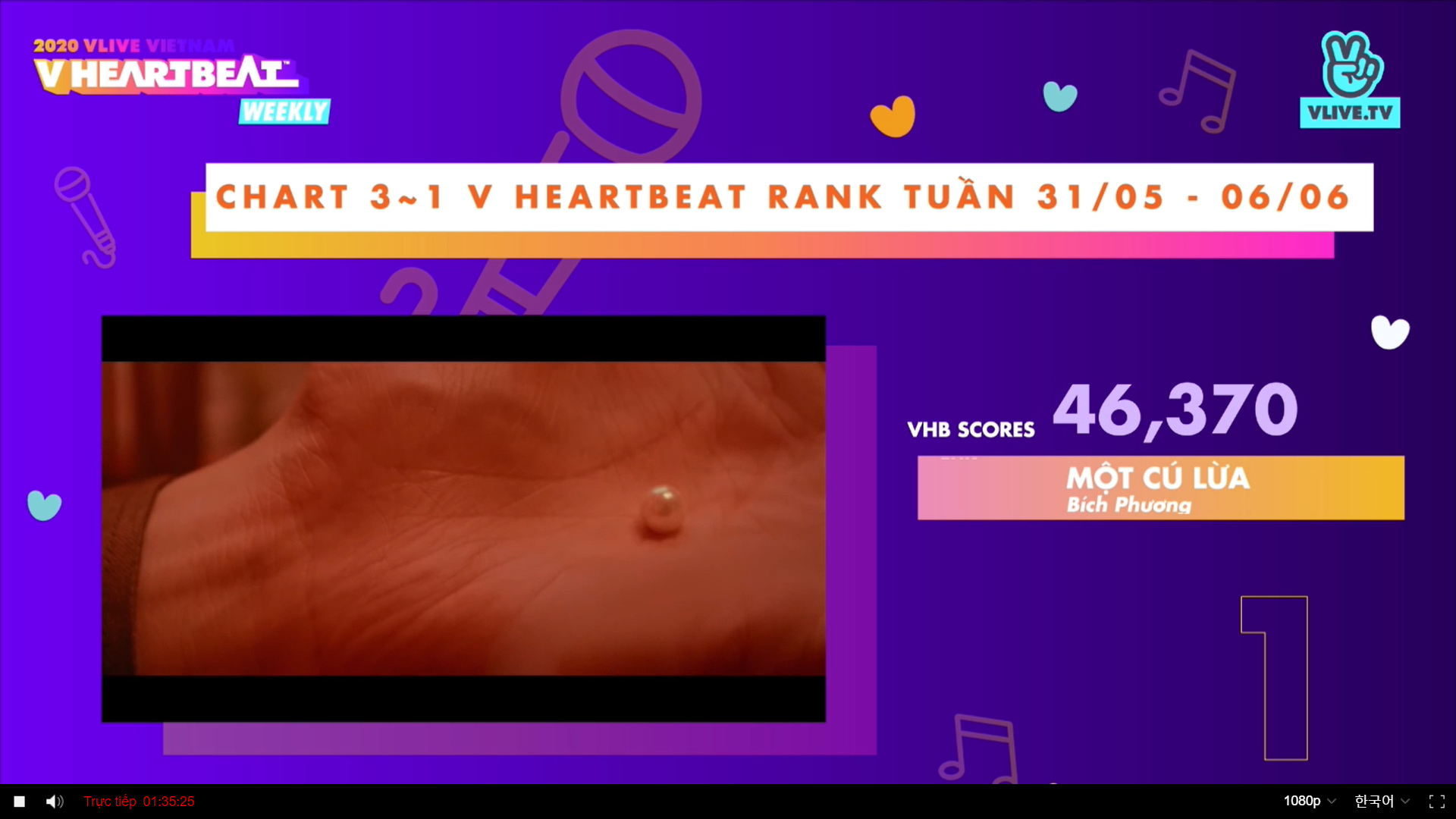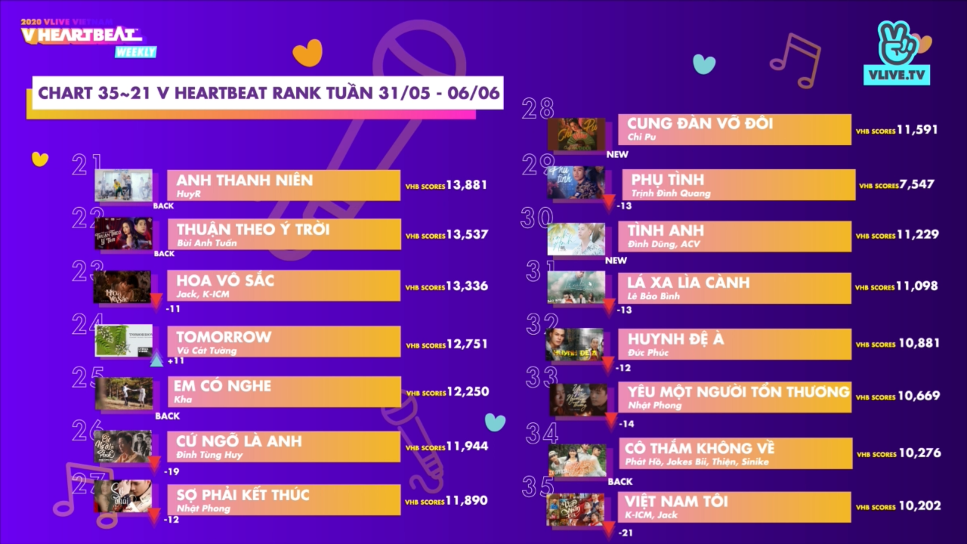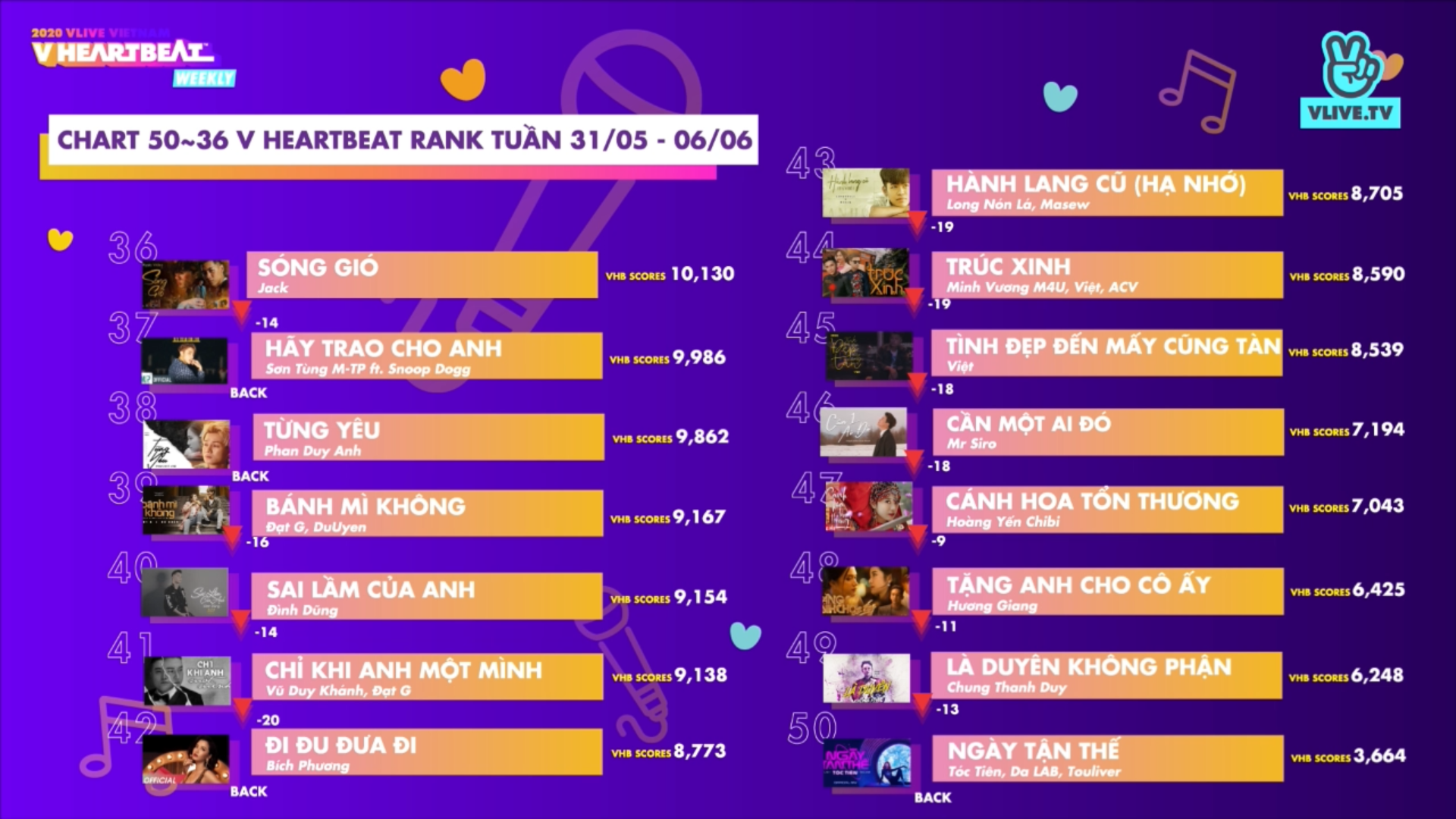 Số điểm V HEARTBEAT RANK được tổng hợp từ Bảng xếp hạng (BXH) âm nhạc Việt Nam (V Music Chart https://vmusicchart.vn/ do CPI x KMCA x Naver thực hiện – chiếm 40% tổng số điểm) cộng lượng tim (20%) và bình chọn (40%) cho MV của các nghệ sĩ Việt trên V TODAY (https://vtoday.vlive.tv/vheartbeat).