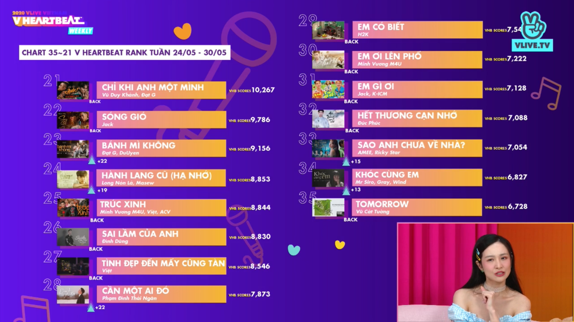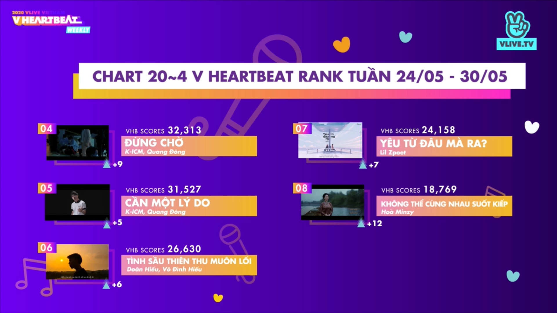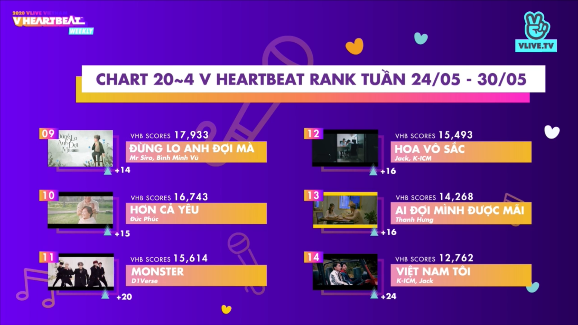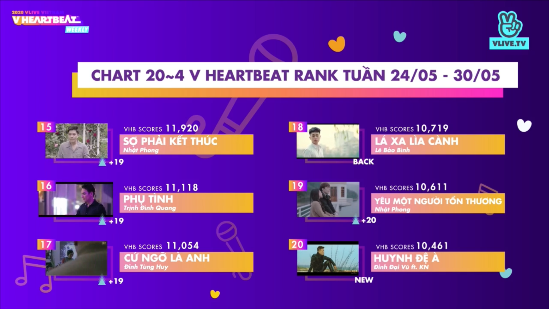 Số điểm V HEARTBEAT RANK được tổng hợp từ Bảng xếp hạng (BXH) âm nhạc Việt Nam (V Music Chart https://vmusicchart.vn/ do CPI x KMCA x Naver thực hiện – chiếm 40% tổng số điểm) cộng lượng tim (20%) và bình chọn (40%) cho MV của các nghệ sĩ Việt trên V TODAY (https://vtoday.vlive.tv/vheartbeat).