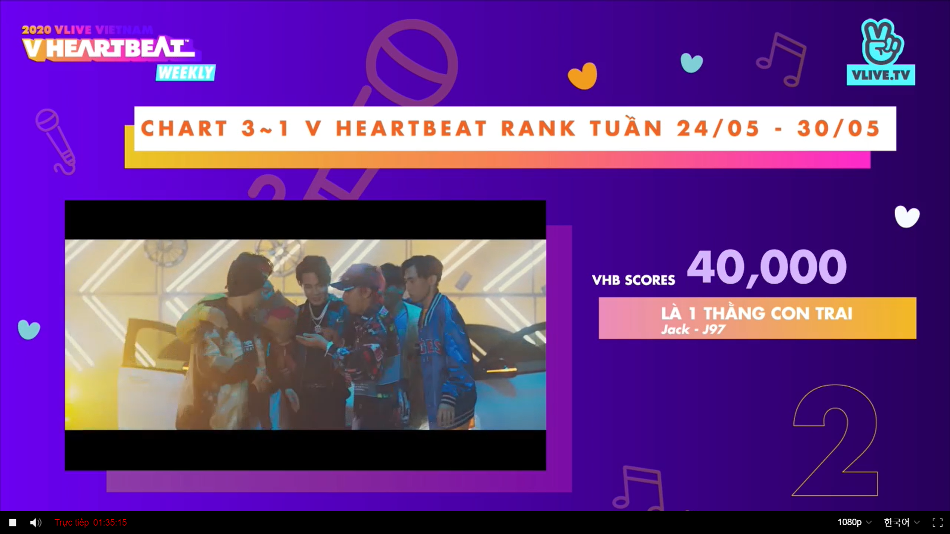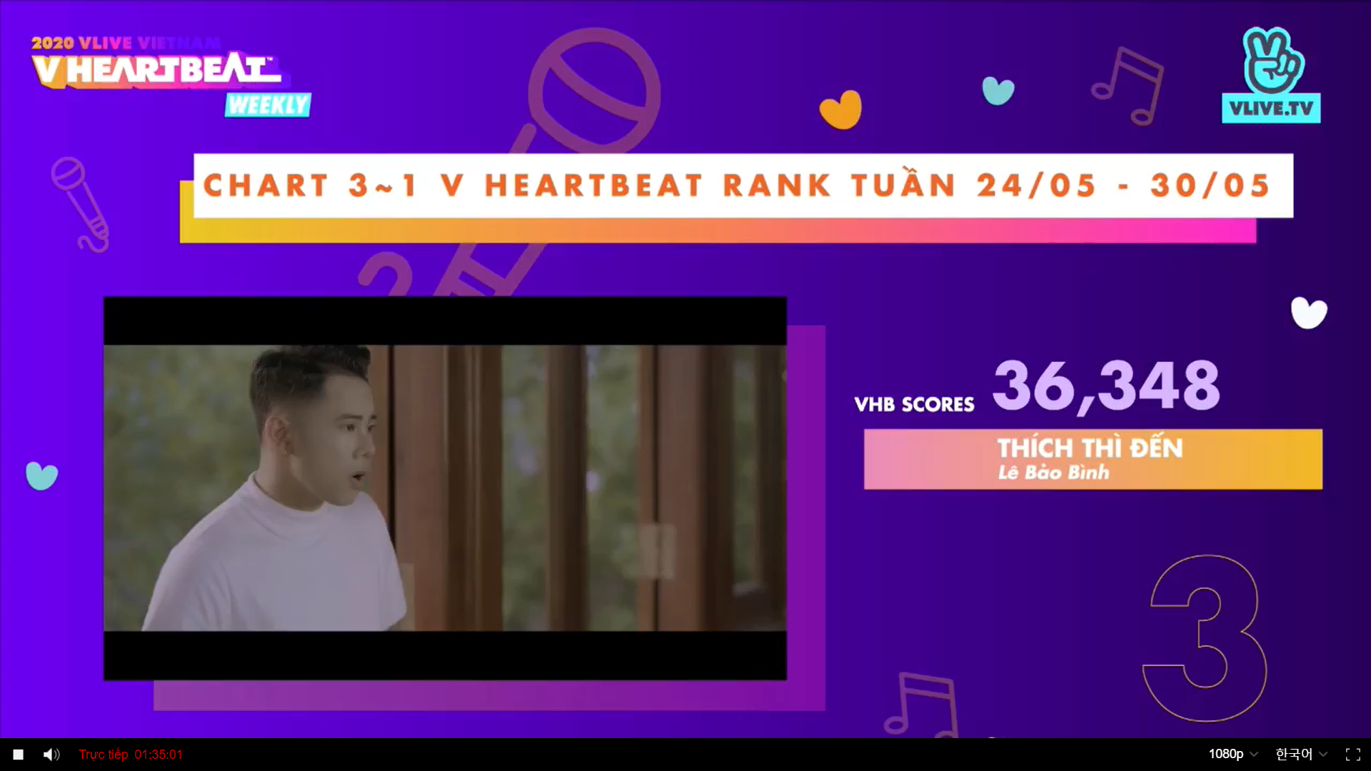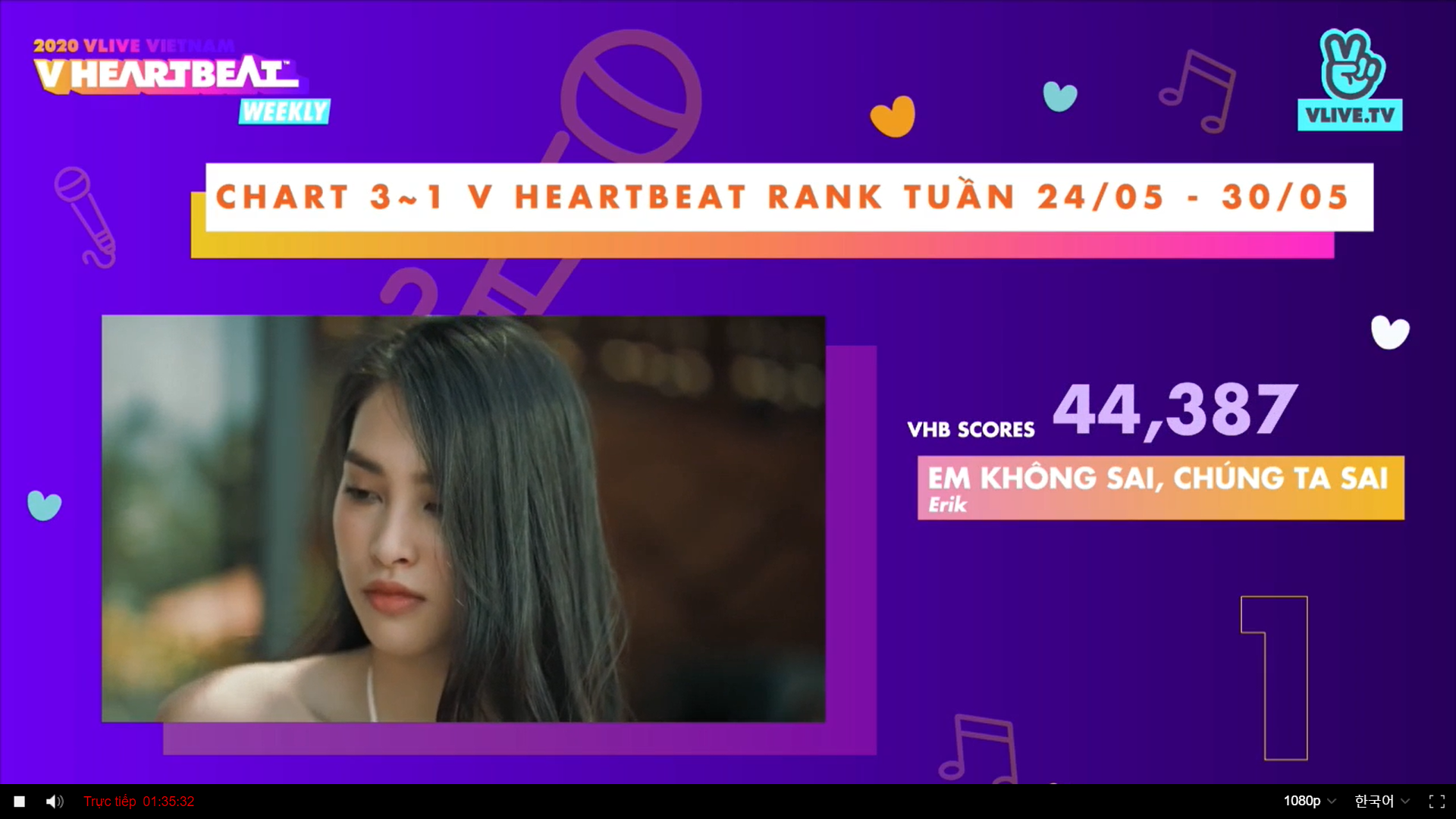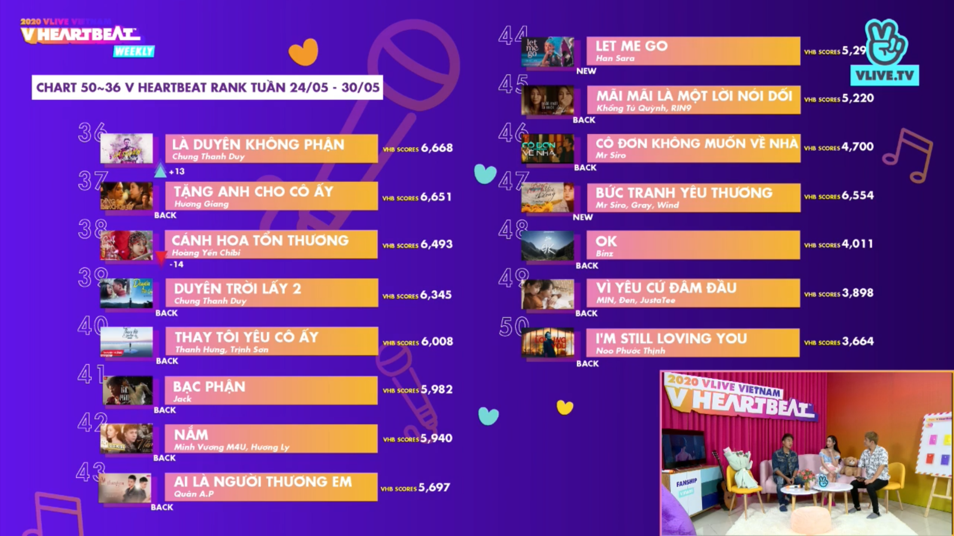 Số điểm V HEARTBEAT RANK được tổng hợp từ Bảng xếp hạng (BXH) âm nhạc Việt Nam (V Music Chart https://vmusicchart.vn/ do CPI x KMCA x Naver thực hiện – chiếm 40% tổng số điểm) cộng lượng tim (20%) và bình chọn (40%) cho MV của các nghệ sĩ Việt trên V TODAY (https://vtoday.vlive.tv/vheartbeat).