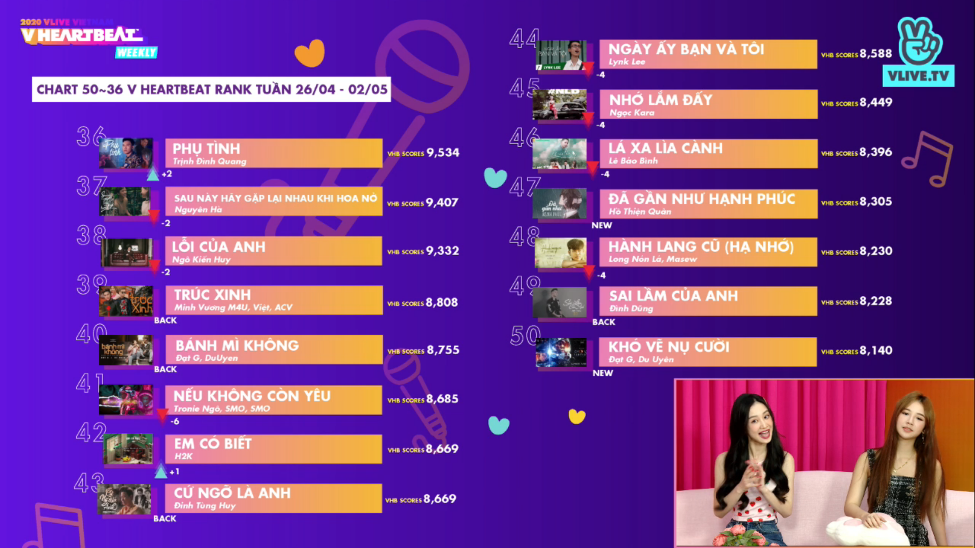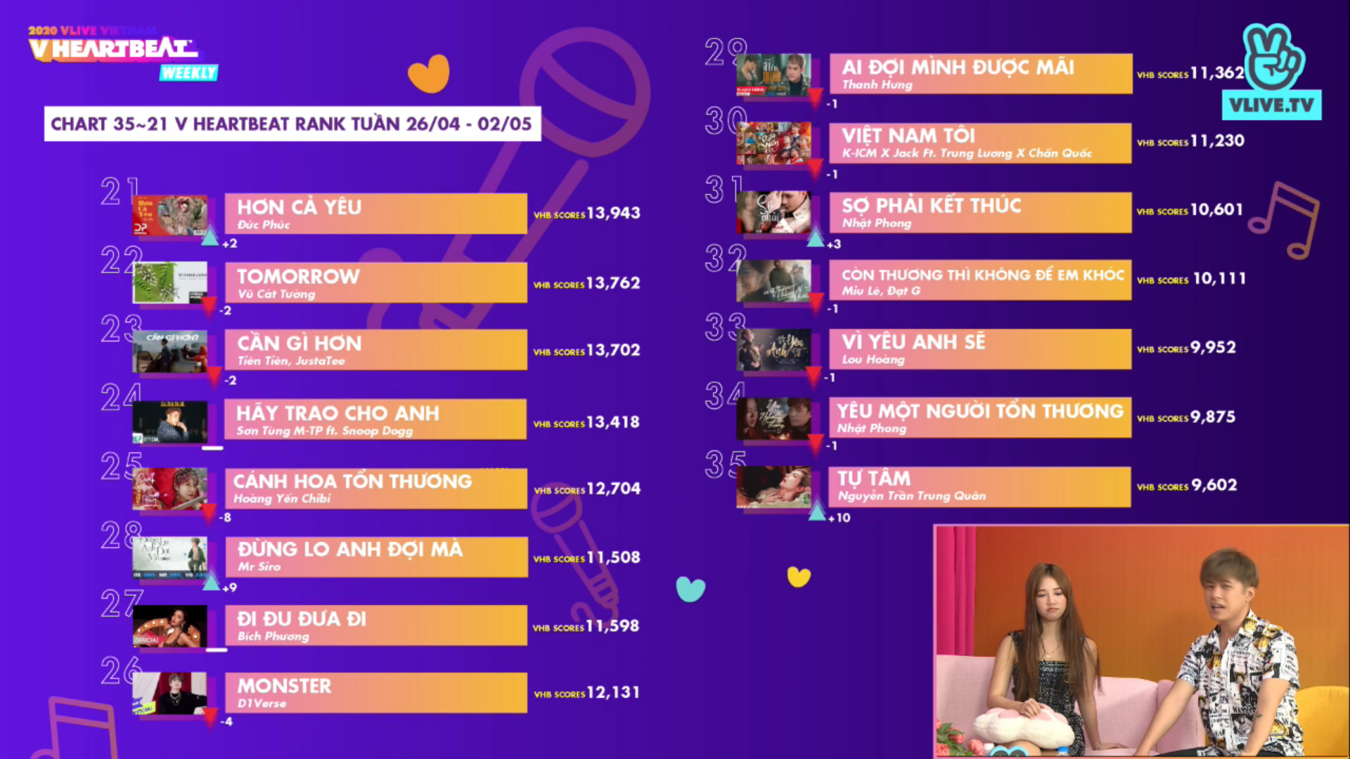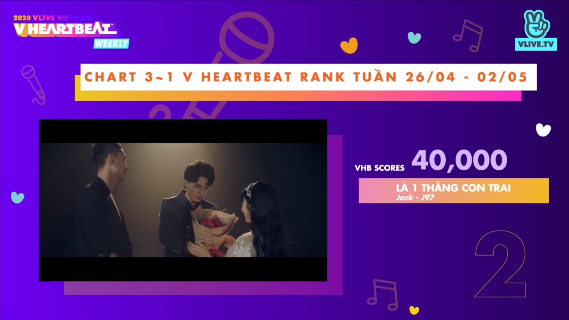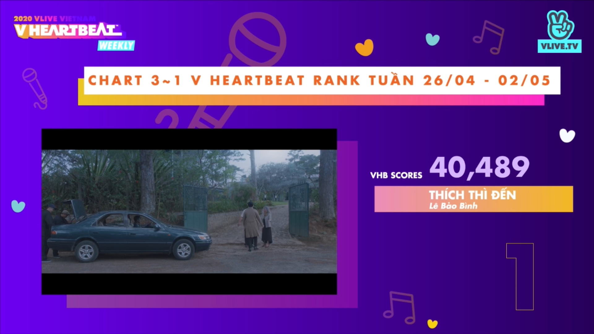 Số điểm V HEARTBEAT RANK được tổng hợp từ Bảng xếp hạng (BXH) âm nhạc Việt Nam (V Music Chart https://vmusicchart.vn/ do CPI x KMCA x Naver thực hiện - chiếm 40% tổng số điểm) cộng lượng tim (20%) và bình chọn (40%) cho MV của các nghệ sĩ Việt trên V TODAY (https://vtoday.vlive.tv/vheartbeat).