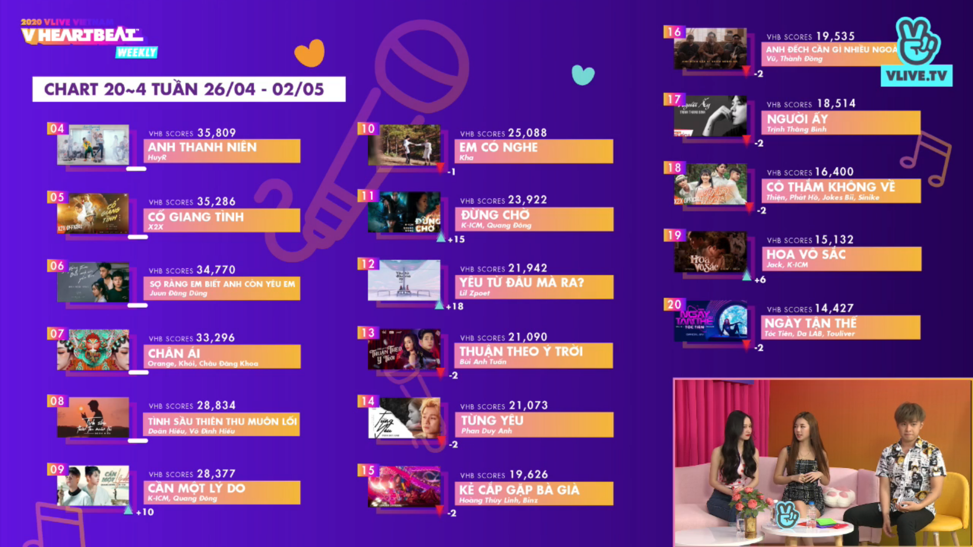 Hai VJ của chương trình là Jun Vũ - Gin Tuấn Kiệt không giấu được niềm hào hứng với sự xuất hiện của vị khách mời ngày hôm nay. Không để khán giả đợi lâu, bộ ba của chương trình nhanh chóng nhập cuộc để cùng nhau tìm ra những chủ nhân của các thứ hạng trong BXH V Heartbeat Weekly.